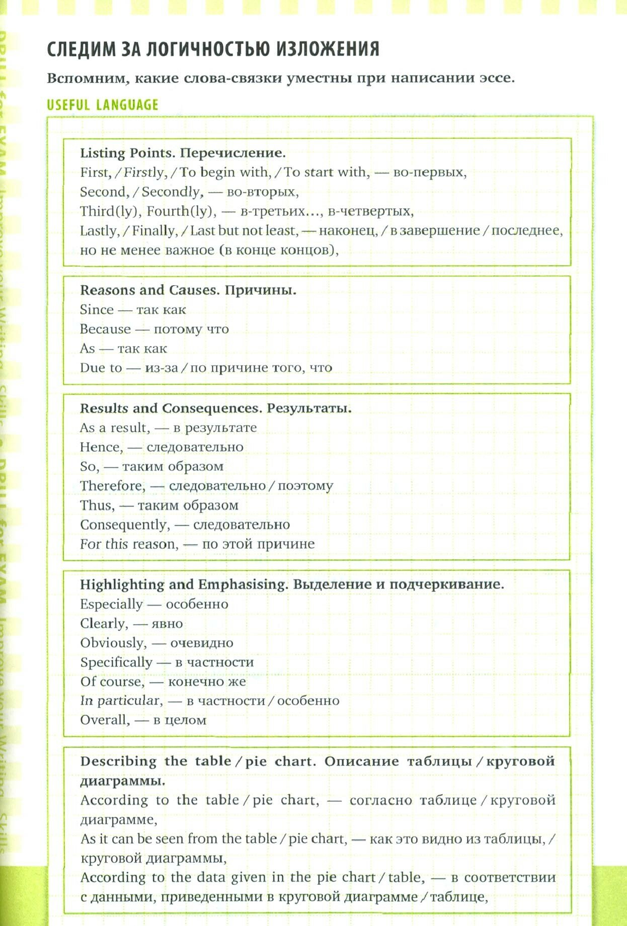 Пособие обеспечивает пошаговую подготовку к заданиям части "Письмо" ЕГЭ по английскому языку. Детальные объяснения особенностей каждого задания, анализ работ в формате экзамена, пошаговое написание самых сложных работ, банк полезных фраз и выражений помогут старшеклассникам качественно подготовиться к ЕГЭ по английскому языку и станут незаменимым помощником как в классе, так и при самостоятельной подготовке. Пособие также содержит 30 тренировочных тестов, обеспечивающих достаточную подготовку для учащихся любого уровня.