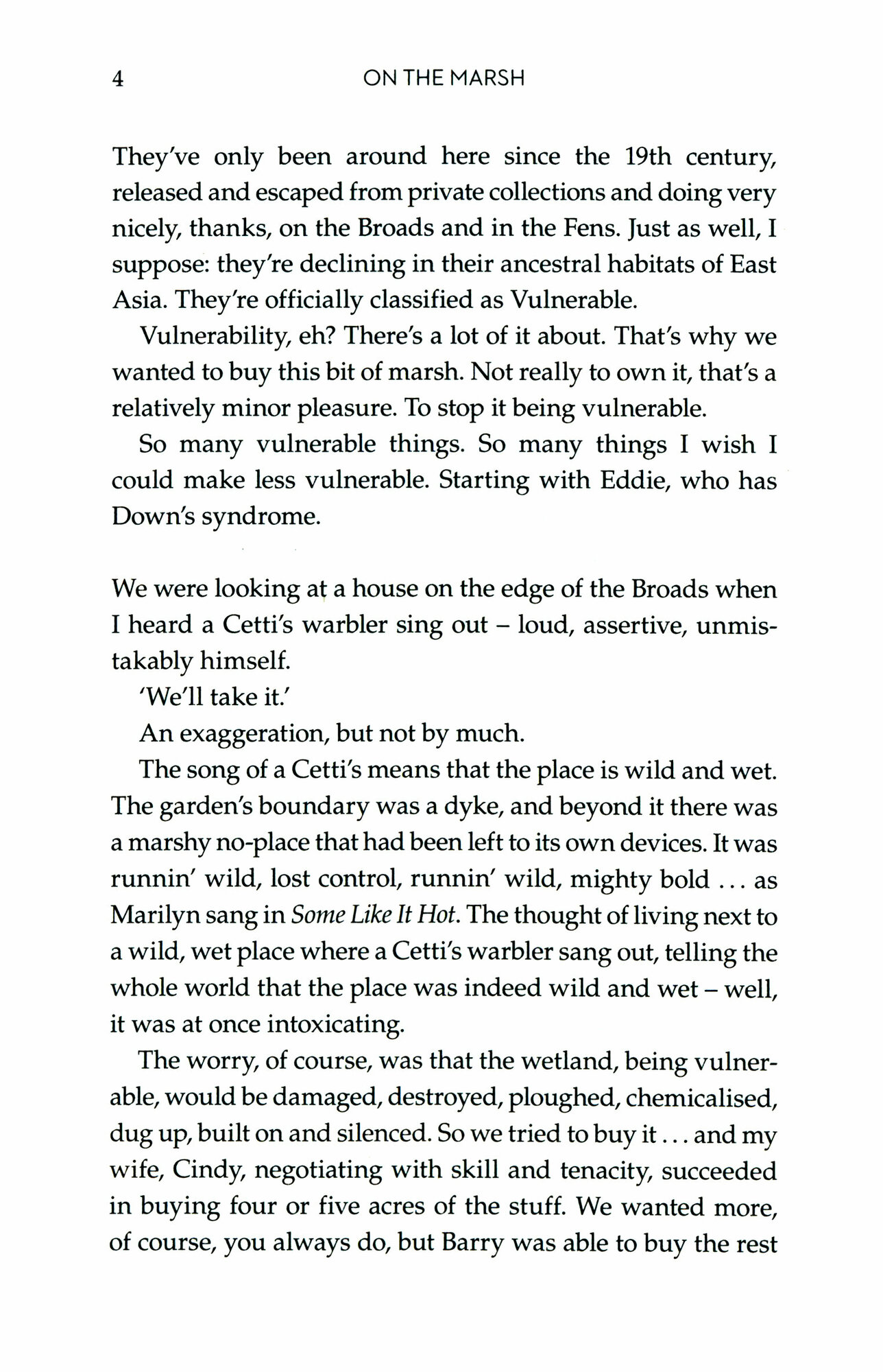 When writer Simon Barnes heard a Cetti's warbler sing out as he turned up to look at a house for sale, he knew immediately that he had found his new home. The fact that his garden backed onto an area of marshy land only increased the possibilities, but there was always the fear that it might end up in the wrong hands and be lost to development or intensive farming. His wife saw through the delicate negotiations for the purchase. Once they'd bought it, they began to manage it as a conservation area, working with the Wildlife Trust to ensure it became as appealing as possible to all species. For their son Eddie, who has Down's syndrome, it became a place of calm and inspiration.