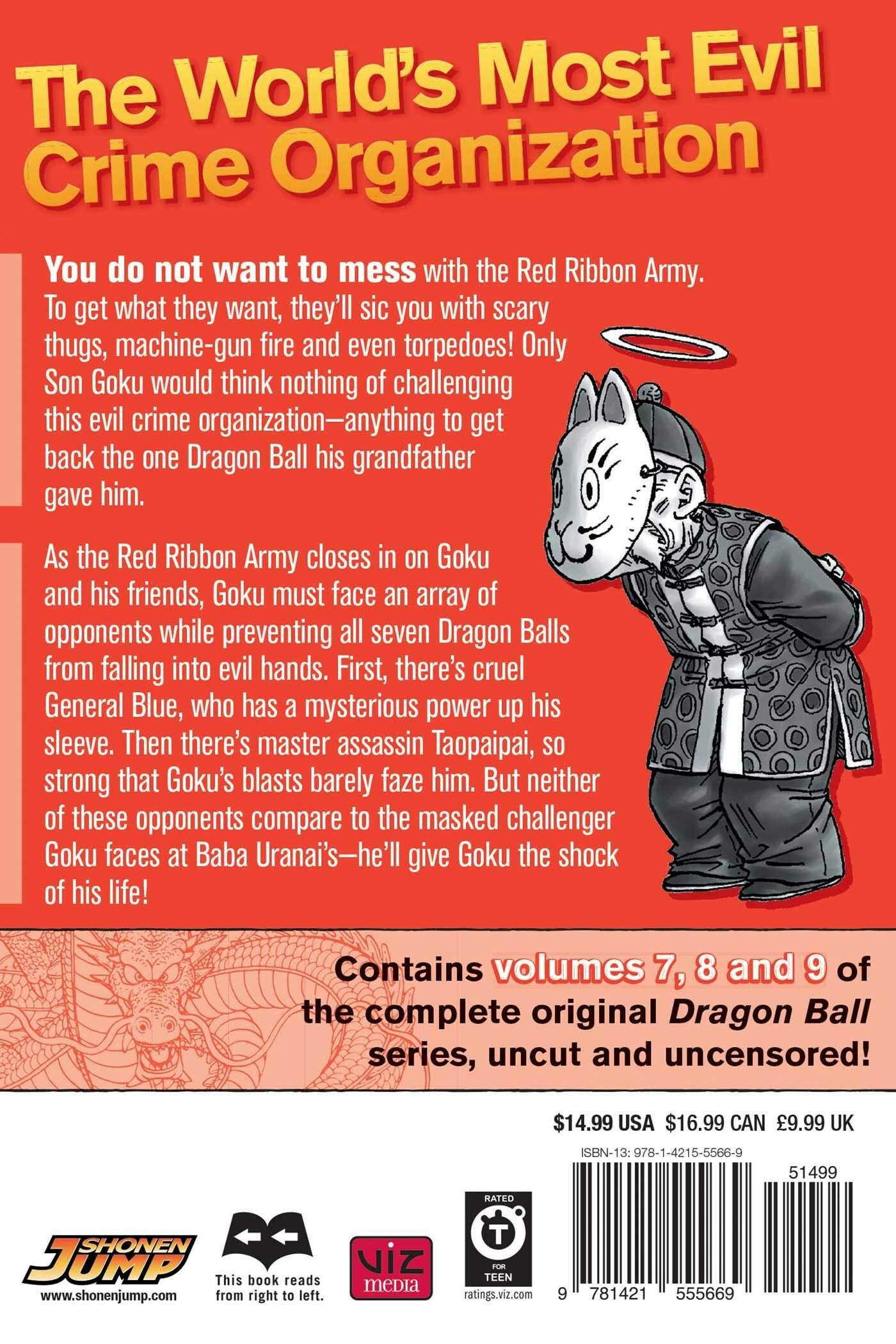 The World's Most Evil Crime Organization You do not want to mess with the Red Ribbon Army. To get what they want, they'll sic you with scary thugs, machine gunfire, and even torpedoes! Only Son Goku would think nothing of challenging this evil crime organization-anything to get back the one Dragon Ball his grandfather gave him. As the Red Ribbon Army closes in on Goku and his friends, Goku must face an array of opponents while preventing all seven Dragon Balls from falling into evil hands. First, there's cruel General Blue, who has a mysterious power up his sleeve. Then there's master assassin Taopaipai, so strong that Goku's blasts barely faze him. But neither of these opponents compare to the masked challenger Goku faces at Baba Uranai's-he'll give Goku the shock of his life!