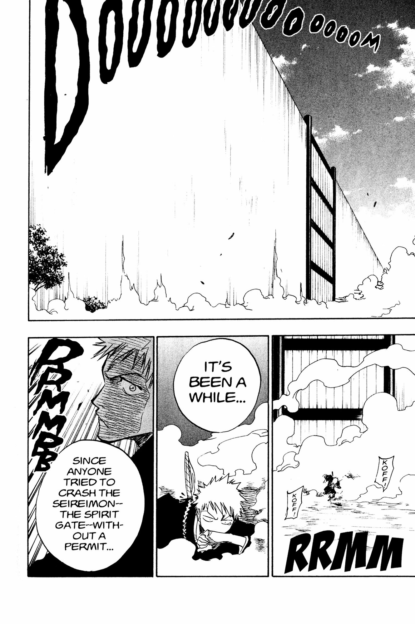 The race to save Rukia from the Soul Society is officially on, and Ichigo and company have come to their first roadblock, a very, verybig roadblock. Jindanbo, the monstrous, fez-sporting gatekeeper hasn't let a single soul enter the Western Gate he guards in over 300 years, and he isn't about to change his mind about it just because Ichigo's crew wants to go through either. But, in a where-the-rubber-meets-the-road kind of way, Ichigo wasn't expecting his assault on the Soul Society to be a piece of cake either. After all, that'd just be boring.