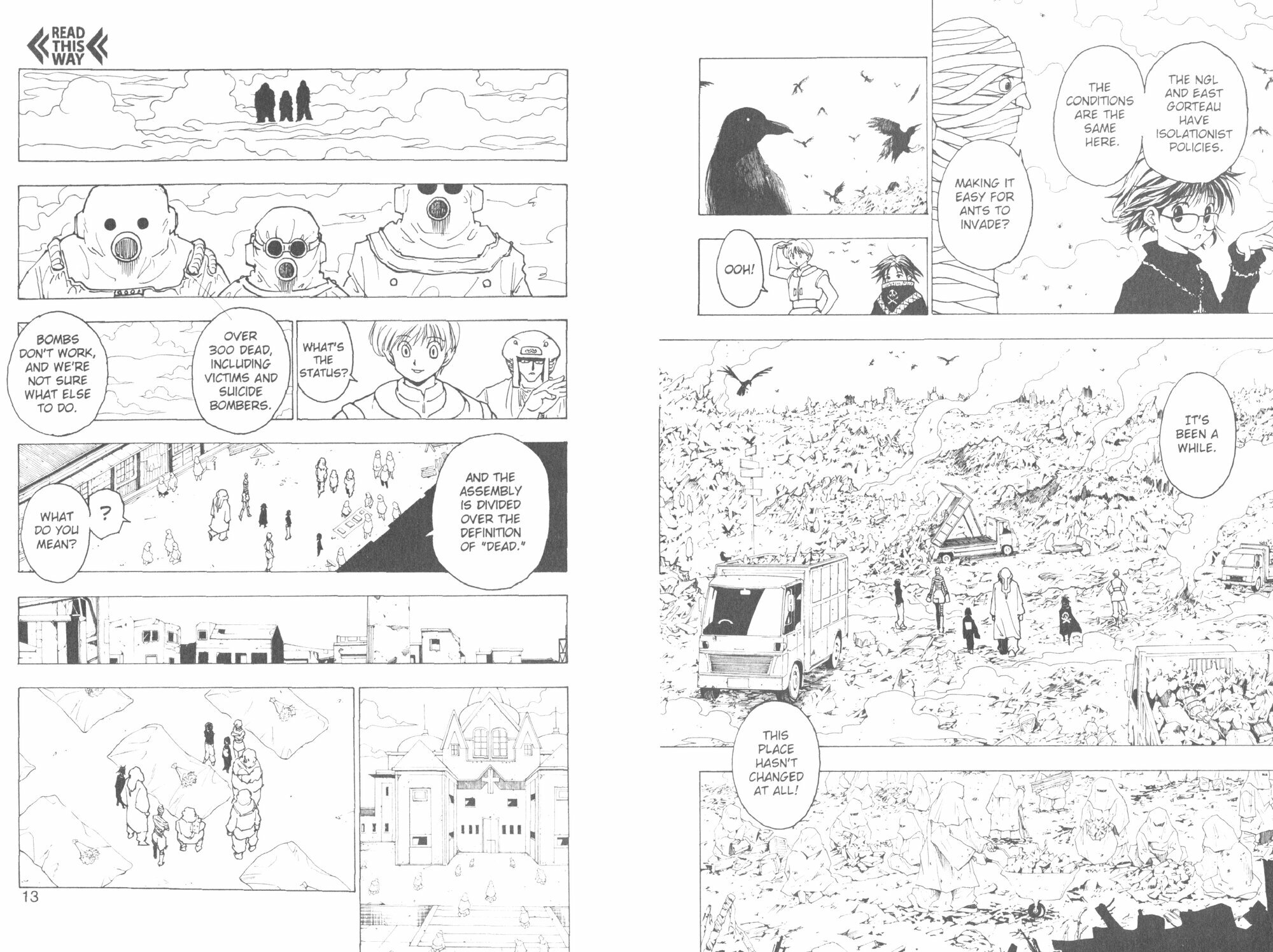 Having lost their queen, the Chimera Ants are spreading beyond their native homeland to establish their own colonies. Some attack Meteor City, and the group of assassins known as the Spiders, are called home to fend off the invasion. Meanwhile, in the Republic of East Gorteau, Gon and Killua realize that entire populations of towns are going missing. They decide to find out what's happening and try to stop it, but Gon soon realizes he's not alone, and whoever's following him is not friendly!