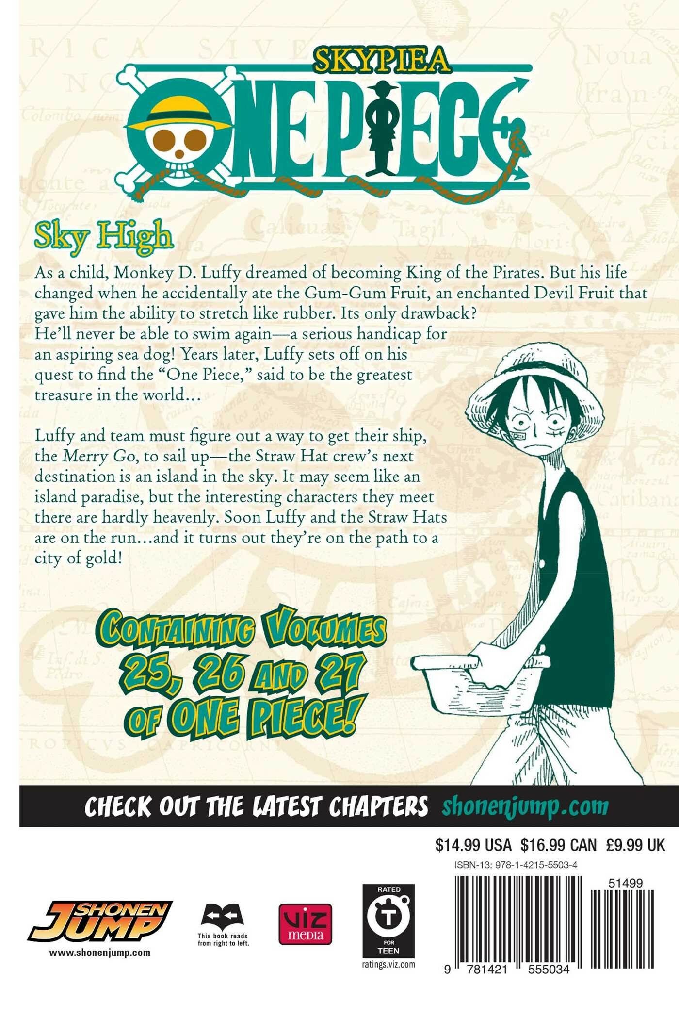 Luffy and team must figure out a way to get their ship, the Merry Go, to sail up - the Straw Hat crew's next destination is an island in the sky. It may seem like an island paradise, but the interesting characters they meet there are hardly heavenly. Soon Luffy and the Straw Hats are on the run but they won't back down until they've got some gold!