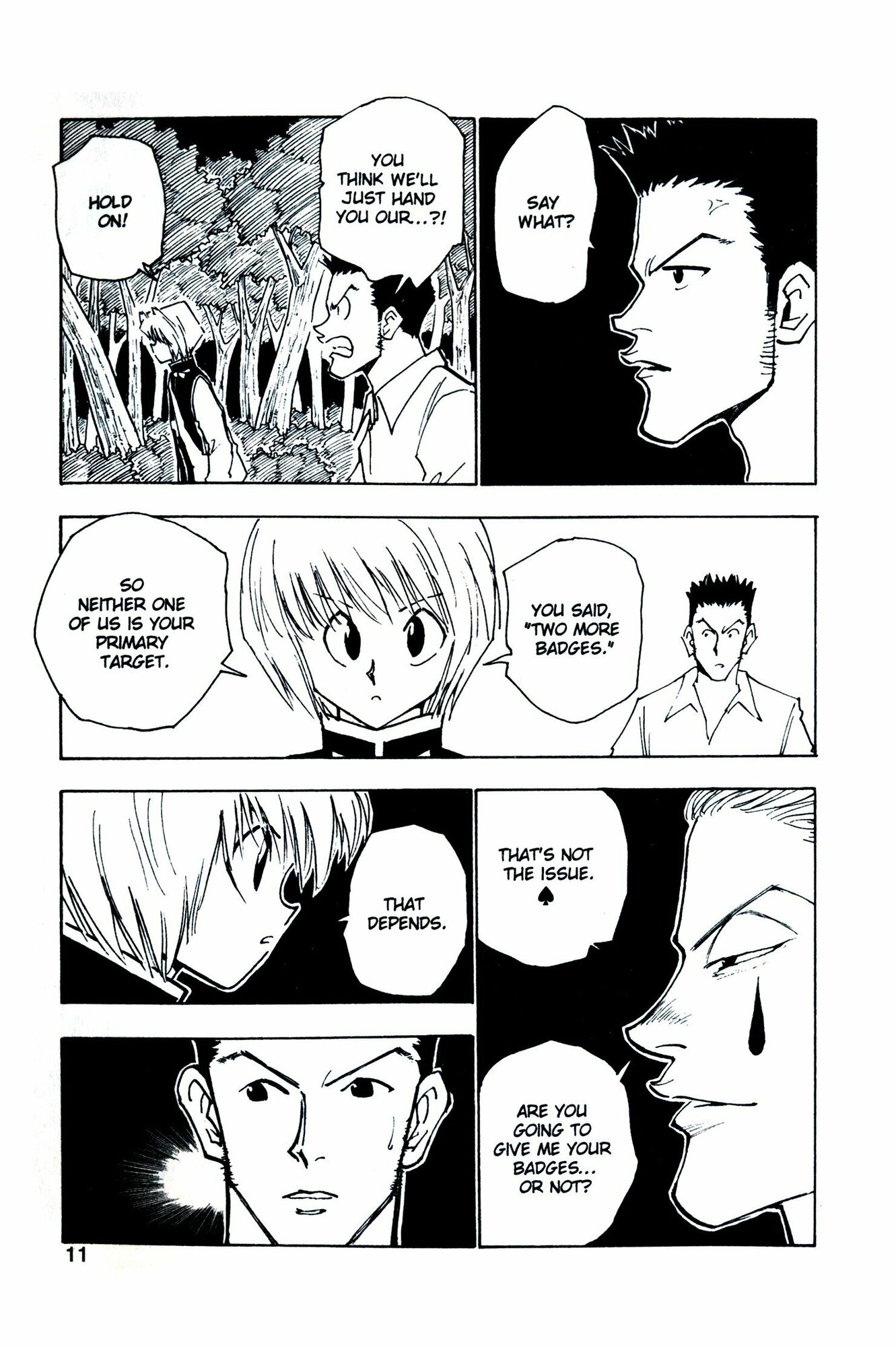 The fourth exam rages on as the Hunter hopefuls try to gain points by stealing each other's badges. Gon, Kurapika, and Leorio fall into a trap set for another applicant and must face a pit full of poisonous snakes. When Leorio is bitten, Gon braves the snakes to snatch the antidote and a badge!