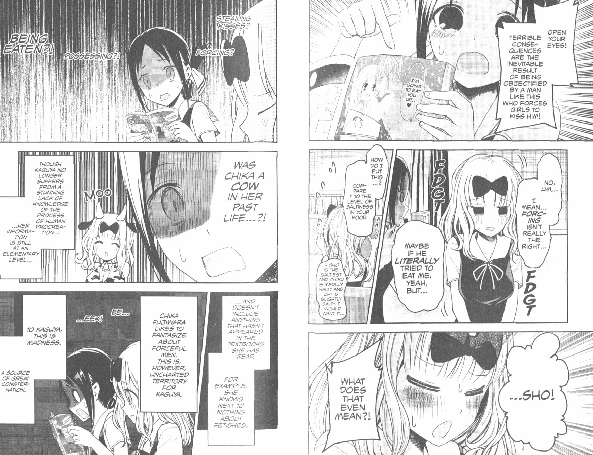 Will Kaguya and Miyuki share the shelter of an umbrella in a storm? Is carrying a knife dripping with blood proof that Kaguya is trying to kill a member of the student council? How will Kaguya react when Chika introduces her to potty humor? Then, Chika must intervene when Miyuki dispenses bad advice on a topic he knows nothing about, Miyuki tries to develop his kinesthetic intelligence, and Kaguya and her personal assistant play a practical joke on Miyuki that has dire consequences.