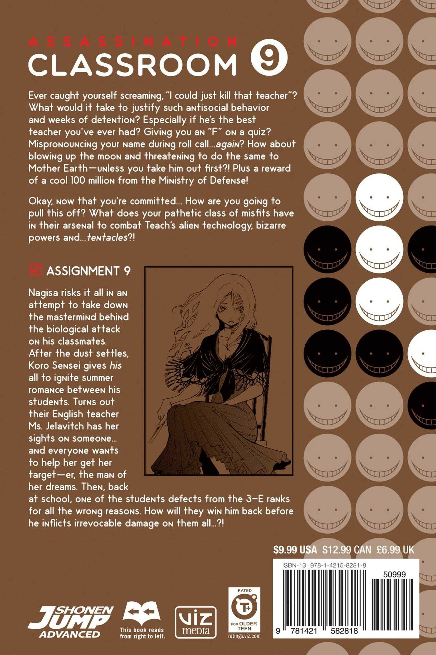 Ever caught yourself screaming, "I could just kill that teacher"? What would it take to justify such antisocial behavior and weeks of detention? Especially if he's the best teacher you've ever had? Giving you an "F" on a quiz? Mispronouncing your name during roll call...again? How about blowing up the moon and threatening to do the same to Mother Earth-unless you take him out first?! Plus a reward of a cool 100 million from the Ministry of Defense! Okay, now that you're committed... How are you going to pull this off? What does your pathetic class of misfits have in their arsenal to combat Teach's alien technology, bizarre powers and...tentacles?! Nagisa risks life and limb in an attempt to take down the mastermind behind a biological attack. After the dust settles, Koro Sensei tries to ignite some summer romances between the students of 3-E. Their teacher Irina Jelavitch, at least, has her sights on someone…and everyone happily conspires to bring them together! Back at school, one of the 3-E students defects from the ranks for all the wrong reasons. How will they bring him back before he inflicts irrevocable damage on them all…?