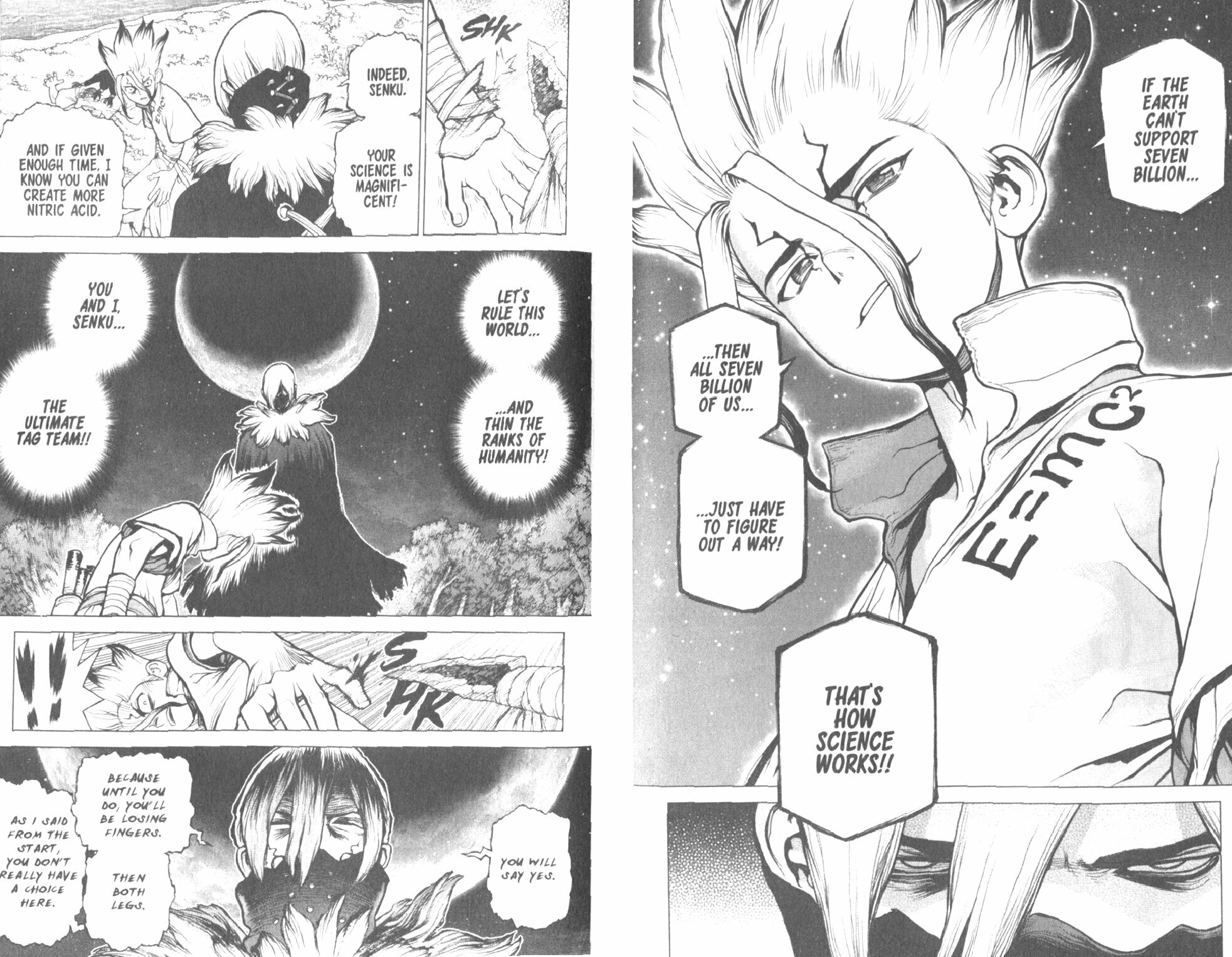 In light of Hyoga's betrayal, Senku and Tsukasa vow to fight together, forming the ultimate tag team! Then, Senku and friends are breezing through more technological advancements in order to solve the mystery behind the petrification, but their impending voyage on the high seas will require a ship and a captain! It's time to relive the age of exploration!