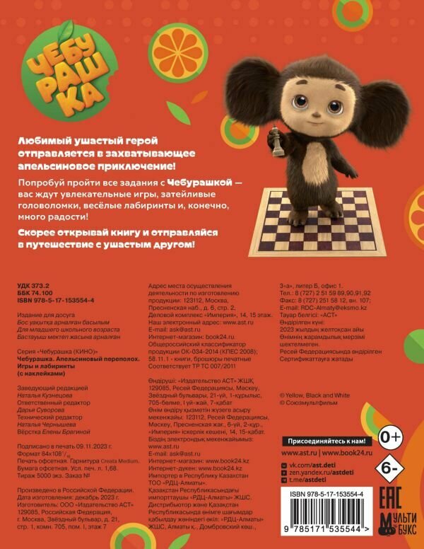 Чебурашка. Апельсиновый переполох. Игры и лабиринты (с наклейками) (Кузнецова Н.); ИЗДАТЕЛЬСТВО "АСТ", 2023