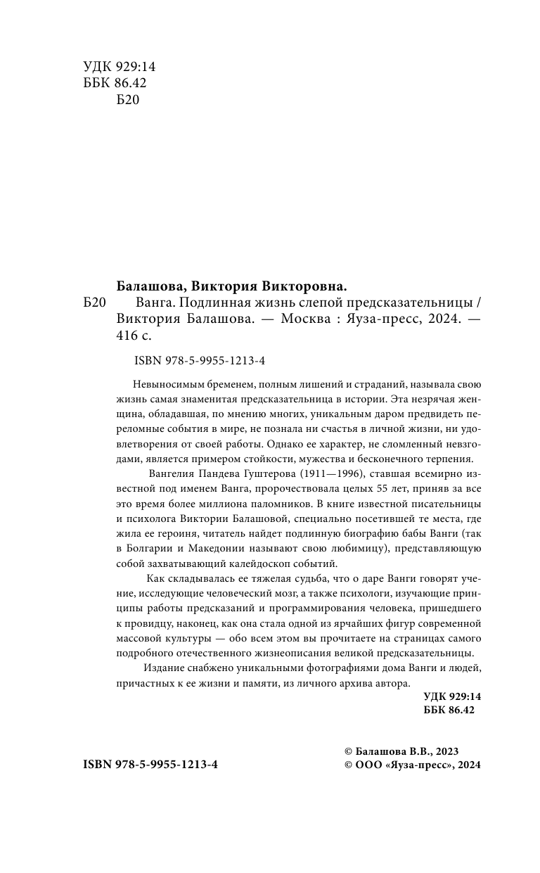 Ванга. Подлинная жизнь слепой предсказательницы (Балашова Виктория Викторовна); Издательство Яуза ООО, 2024