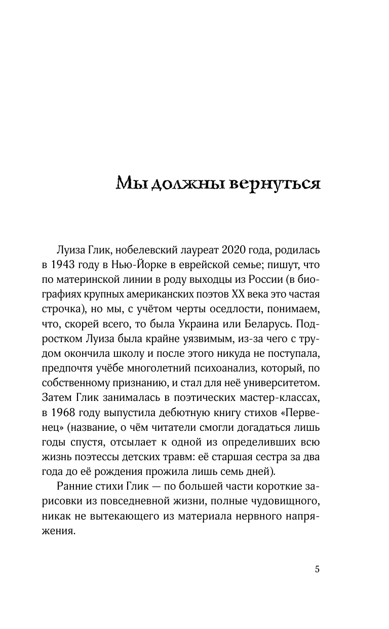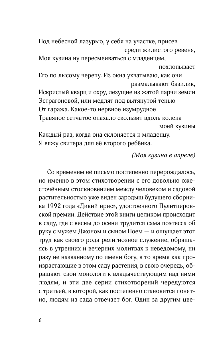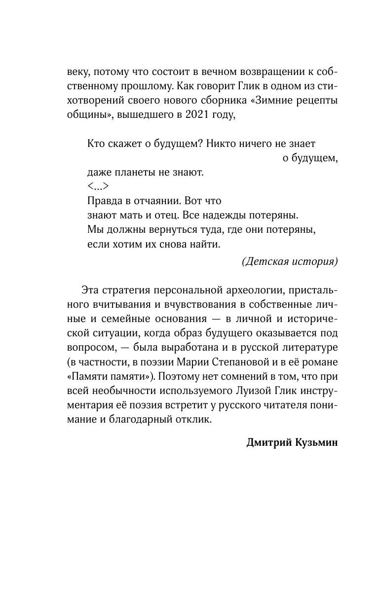 Долгожданное издание лирики Нобелевского лауреата! Стихотворения Глик очень своеобразны, утонченны изящны, но при этом в них нет привычных штампов, напротив, эта поэзия полна воздуха. Образы, создаваемые Глик лаконичны, но при этом их не обвинишь в простоте и незатейливости, за ними таится экзистенциальная бездна. Глик загадочна, как Эмили Дикинсон и меланхолична, как Сильвия Плат, а ее неповторимая поэзия, определенно, заслуживает внимания