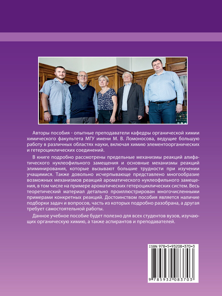 Учебное пособие подготовлено коллективом преподавателей химического факультета МГУ имени М. В. Ломоносова и содержит обобщенную и переработанную информацию по теме, вызывающей наибольшие трудности у учащихся при изучении и освоении дисциплины «Органическая химия». Подробно проведен комплексный анализ основных механизмов, наиболее важных факторов, влияющих на реакционную способность исходных алифатических и ароматических субстратов и определяющих механизм и конечный результат превращений данного типа. Приведены многочисленные примеры конкретных реакций алифатического и ароматического нуклеофильного замещения и элиминирования, иллюстрирующие их широкие синтетические возможности. Издание может быть полезно студентам и аспирантам как в обучающих целях, так и для подготовки к промежуточным экзаменам и итоговой аттестации, а также учителям, преподавателям высшей школы и всем читателям, интересующимся органической химией.