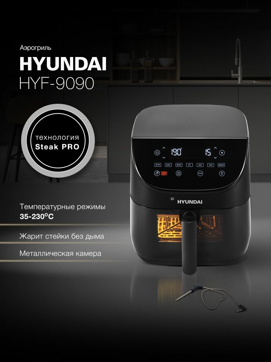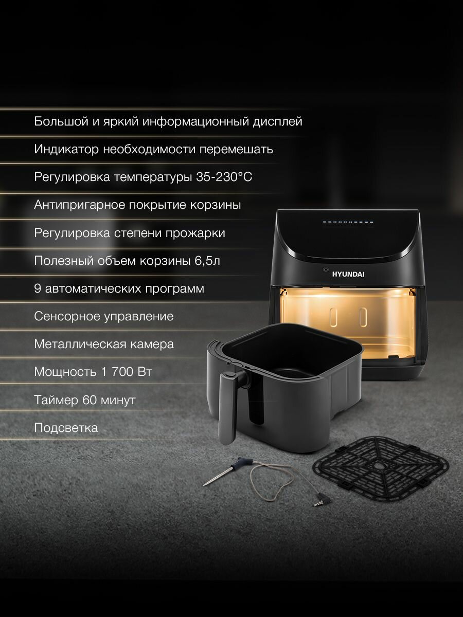 \r\nКомпактный аэрогриль Hyundai – прекрасный вариант для небольших кухонь и квартир-студий. Его возможности по достоинству оценят те, кто любит блюда на гриле, но не имеют возможности и желания стоять у плиты. С Hyundai процесс готовки не потребует постоянного контроля и займет не более получаса, а запустить его можно одним движением.