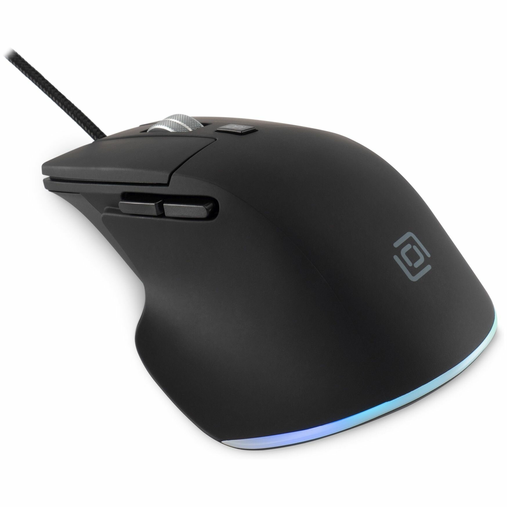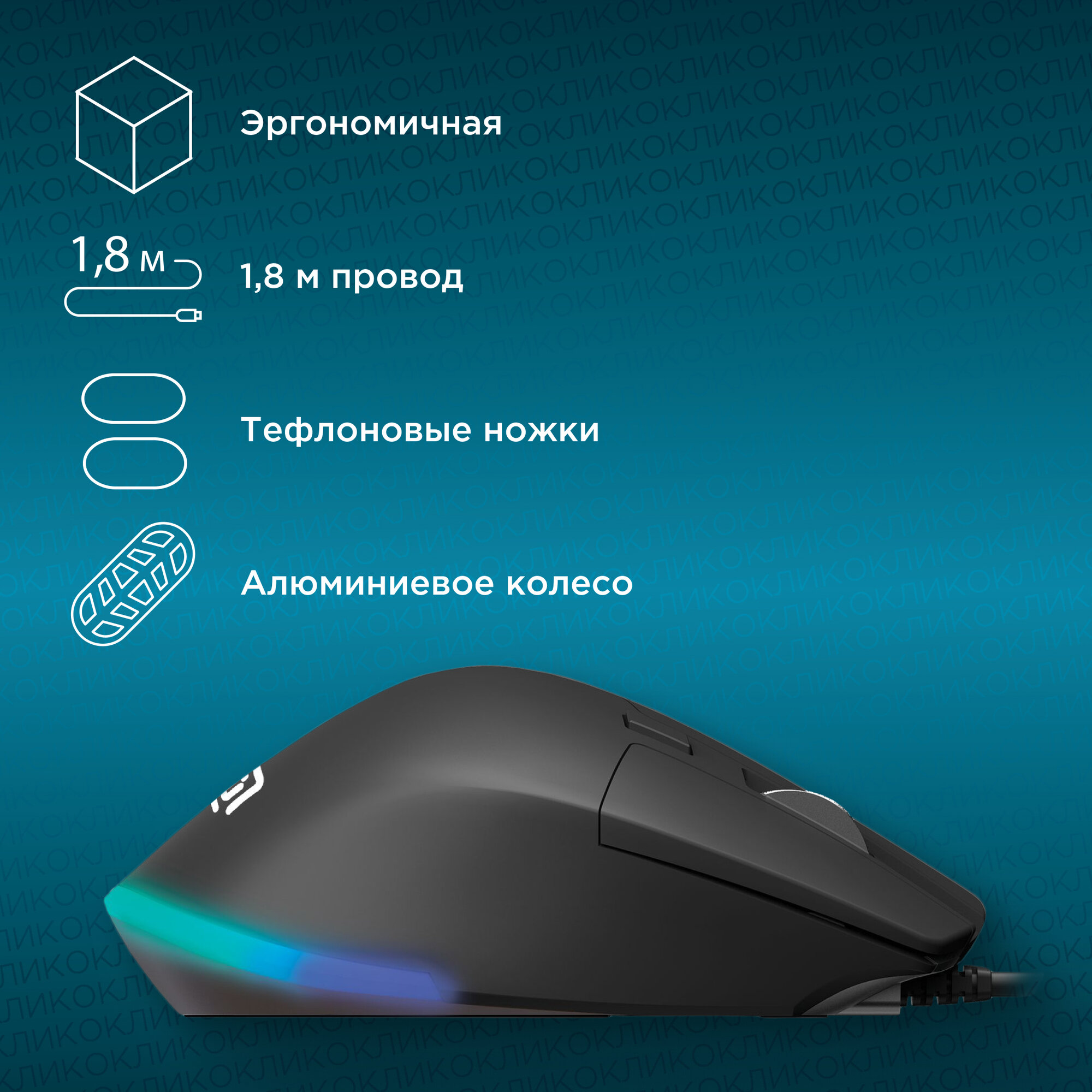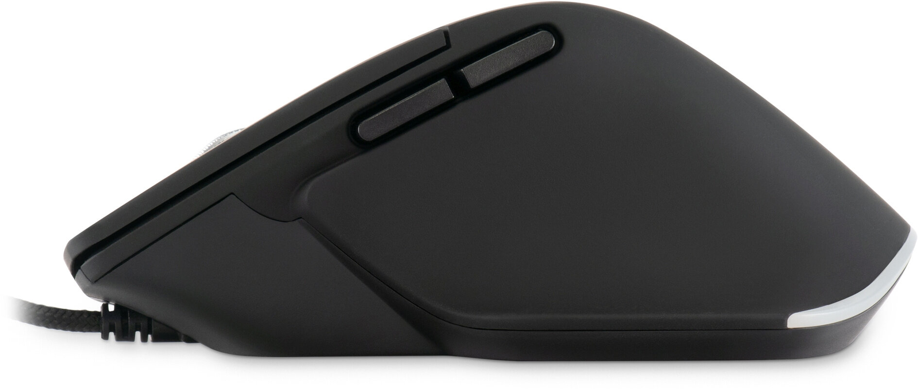 Удобная эргономичная форма, специальное покрытие корпуса, металлическое колесо, бесшумные кнопки, кнопка выключения/изменения подсветки на нижней поверхности; провод в оплетке, высокое разрешение сенсора делает мышь универсальным решением для офиса/дома/игр. Специальное ПО на сайте производителя.