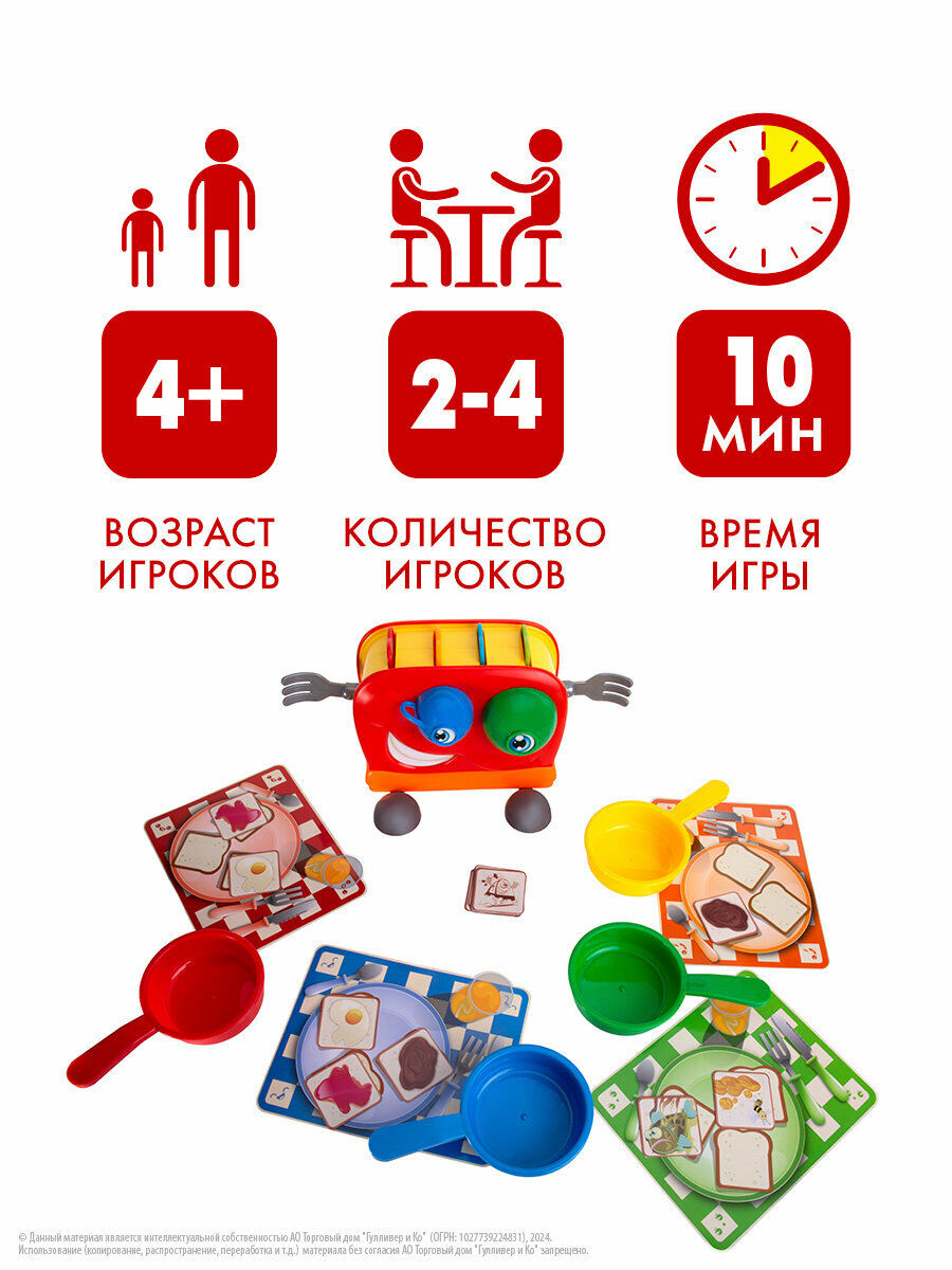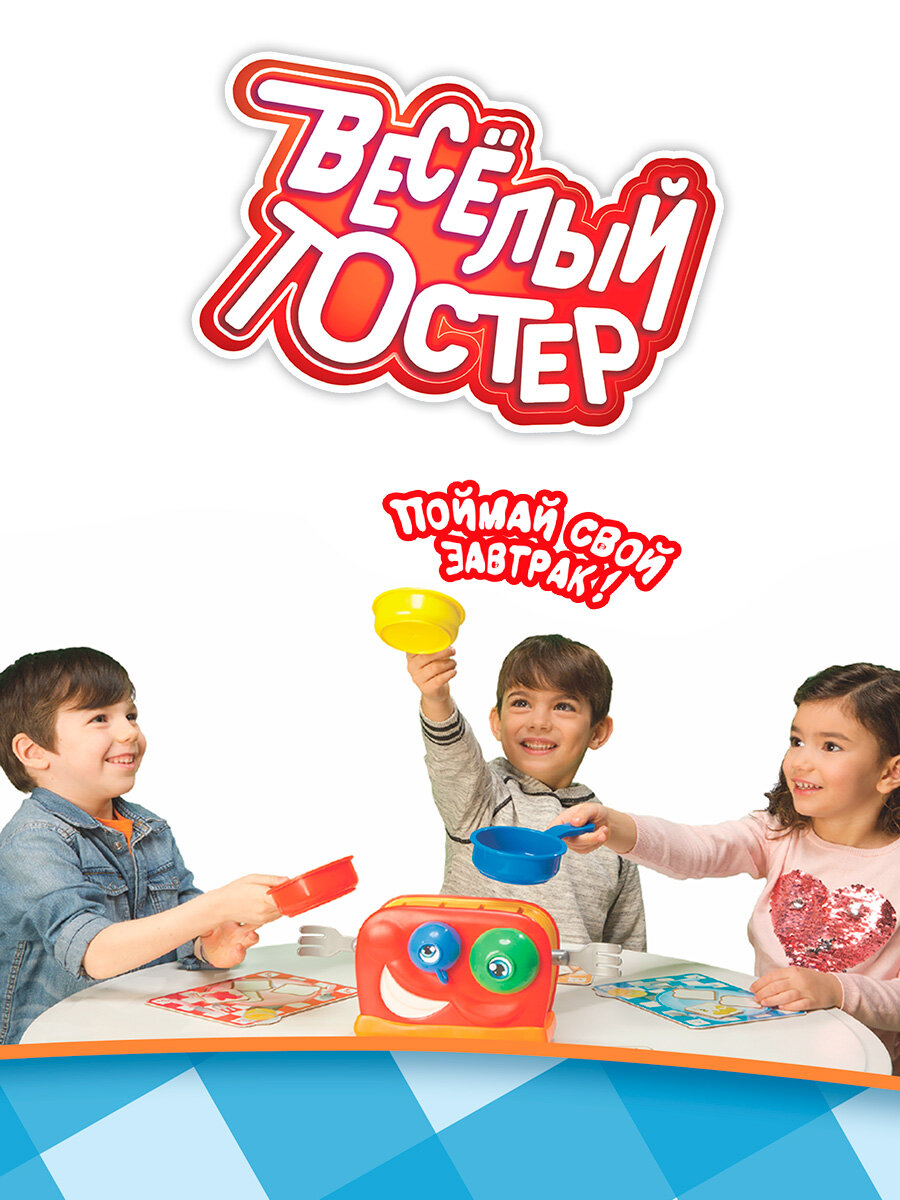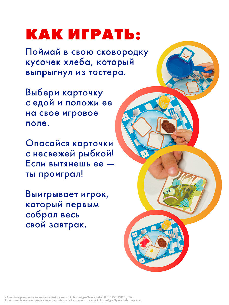 Заряжай тостер и делай завтрак! Новая игра на внимательности и ловкость. В игре могут принимать участие до 4 игроков. Первый игрок нажимает на тостер, после чего из него вылетают тосты. Игроки должны их поймать специальными тарелками (входят в комплект). Все игроки, которым удалось поймать тосты, берут из колоды по одной карте. Выигрывает игрок которому удалось собрать 3 тоста. Но, будь внимателен, если выпадет карточка с тухлой рыбкой, игрок проиграл.