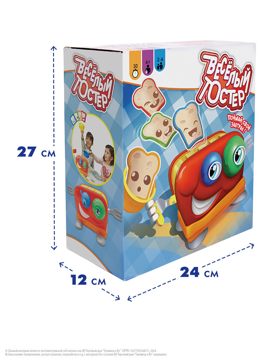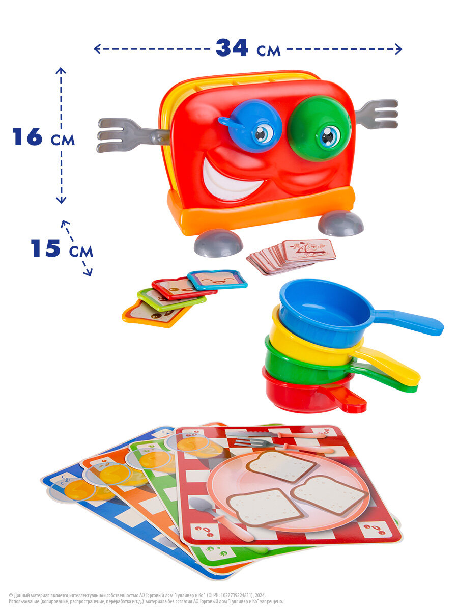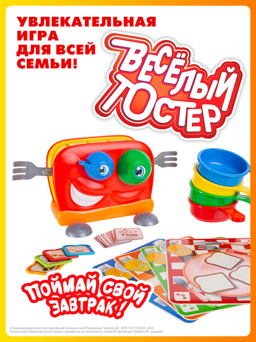 Заряжай тостер и делай завтрак! Новая игра на внимательности и ловкость. В игре могут принимать участие до 4 игроков. Первый игрок нажимает на тостер, после чего из него вылетают тосты. Игроки должны их поймать специальными тарелками (входят в комплект). Все игроки, которым удалось поймать тосты, берут из колоды по одной карте. Выигрывает игрок которому удалось собрать 3 тоста. Но, будь внимателен, если выпадет карточка с тухлой рыбкой, игрок проиграл.