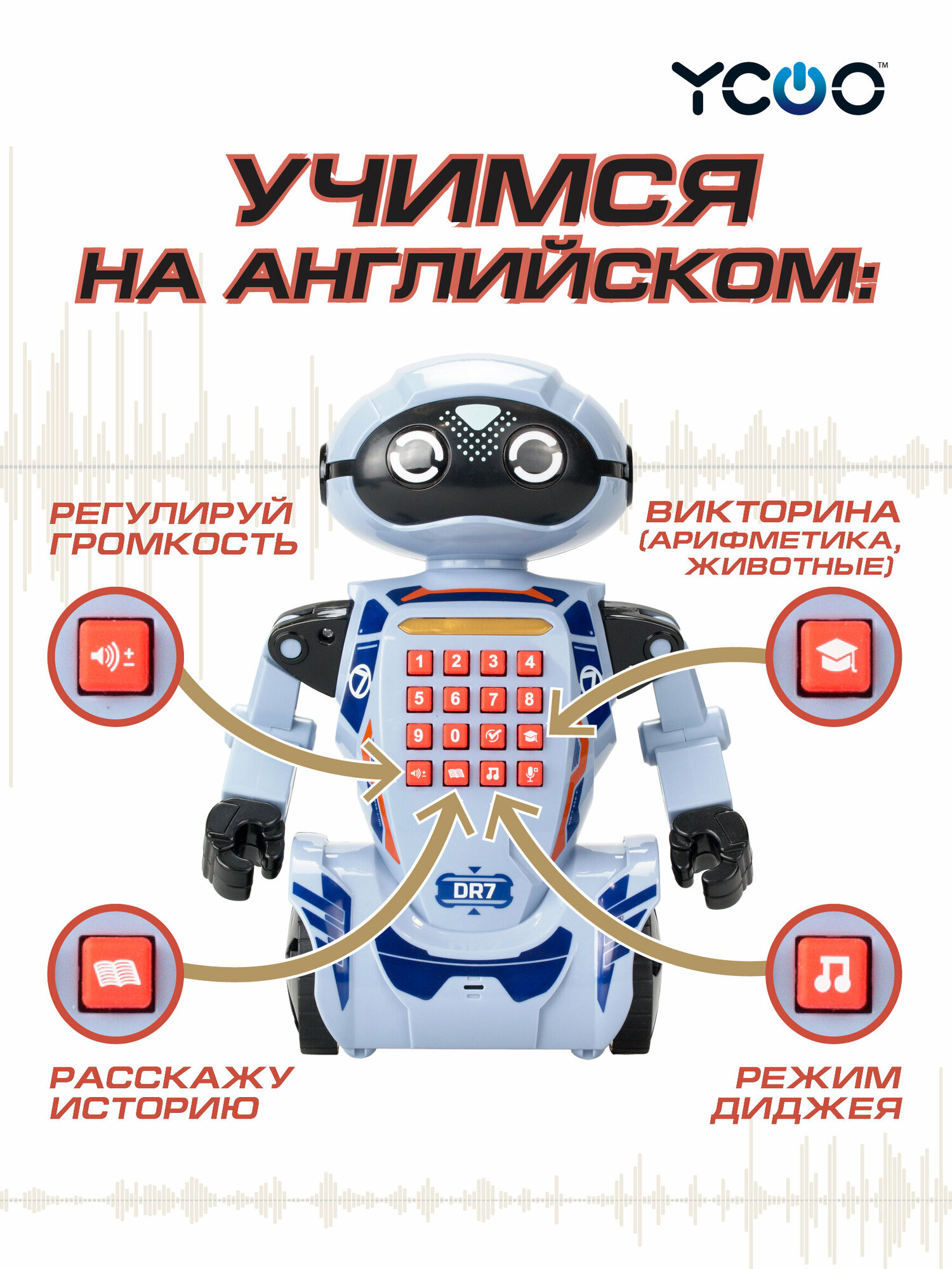 Каждый ребёнок любит изучать новое и пользоваться гаджетами! Эта чудесная развивающая игрушка прекрасно подойдёт для обучения малыша и затянет вас в мир технологий и удивительных возможностей. Радиоуправляемый робот позволит не только развлечься, но и провести время с пользой, развивая умственные способности малыша. Робот DR7 Ycoo - это удивительная обучающая игрушка-робот на пульте управления, с которым можно играть в разные Квиз-викторины! Вместе с роботом можно угадывать мелодии, он также задает загадки на тему "животные", а ещё этот развивающий робот поможет научиться считать. Проверьте свои знания математики, решая задачки на арифметику. Если вы ошибётесь 3 раза, то робот обязательно подскажет правильный ответ. Робот DR7 Ycoo также имеет возможность программирования. С помощью простого джойстика можно записать до 60 шагов. Встроенная функция записи голоса позволяет роботу повторять за ребёнком каждое слово или целые фразы. Интуитивное программирование делает процесс очень простым и доступным для маленьких детей. Робот умеет рассказывать 10 захватывающих историй и даже танцевать. С регулировкой громкости вы всегда сможете настроиться на нужную волну. Играть с Робот DR7 Ycoo весело и познавательно! Как же здорово иметь своего собственного личного радиоуправляемого друга! Идеальный подарок на Новый год, день рождения, 23 февраля.