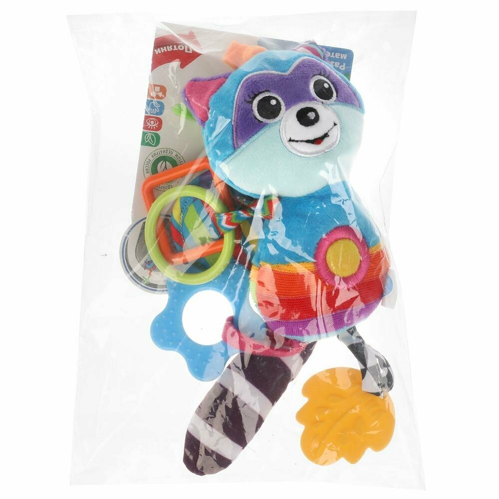Эта очаровательная игрушка в виде милого енота с забавным вибрационным эффектом непременно приведёт ребёнка в восторг. Подвеска выполнена в ярких цветах из очень мягкого и гипоаллергенного материала. Благодаря креплению-клипсе игрушку удобно крепить к кроватке, коляске или дуге. Прорезыватель интересной формы из качественного безопасного материала пригодится малышу, когда у него будут резаться зубки.