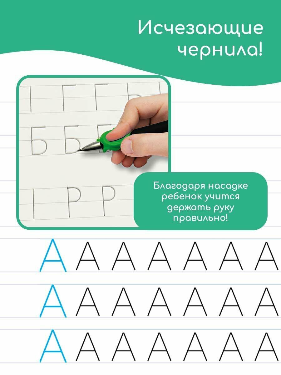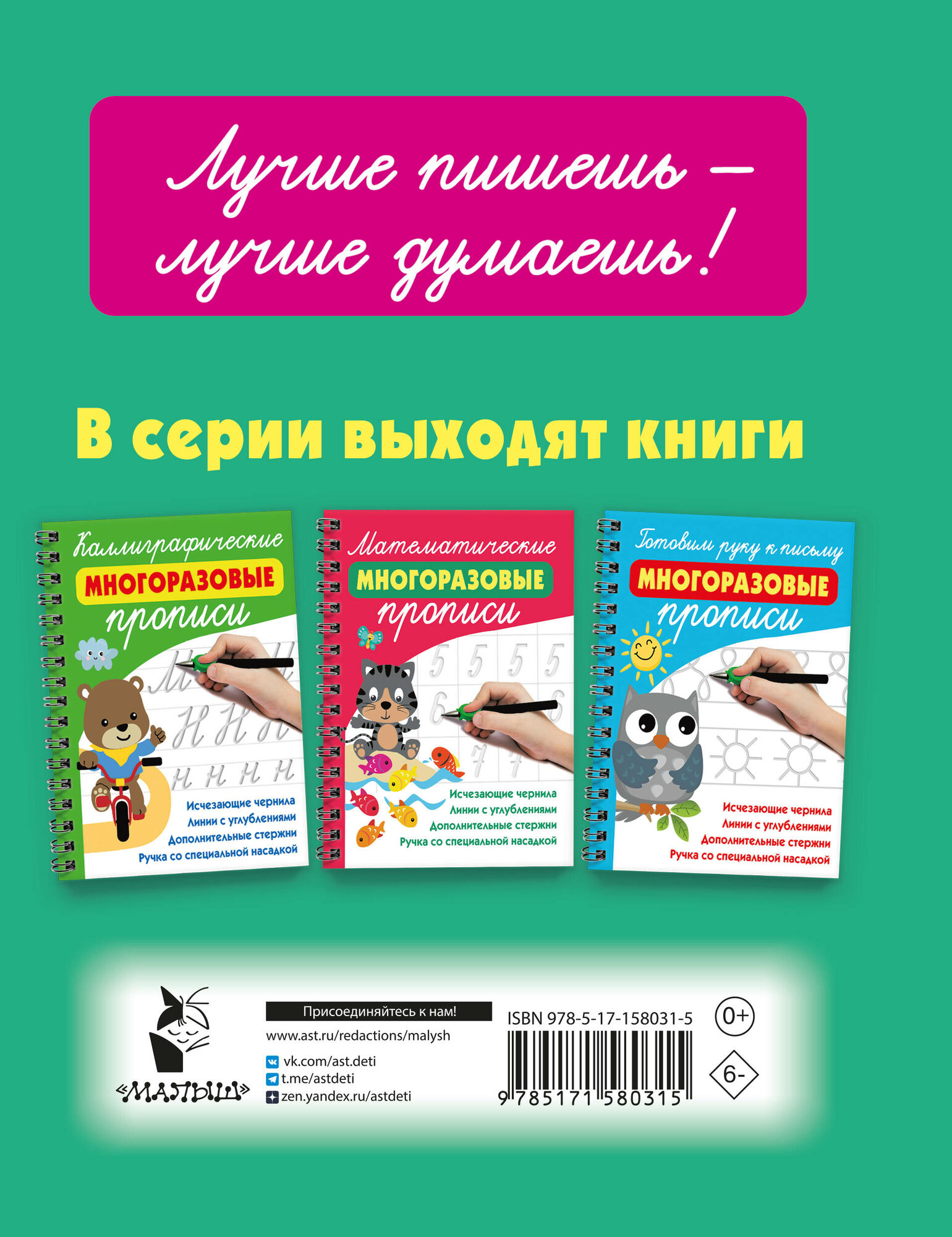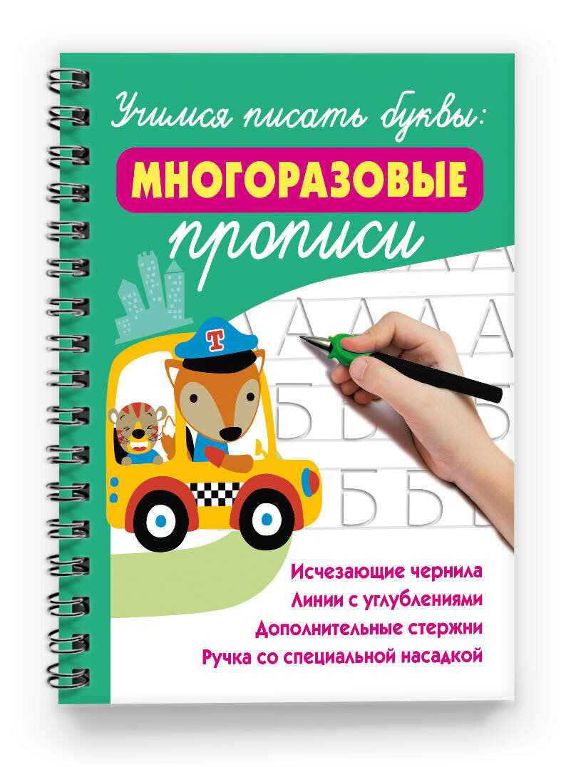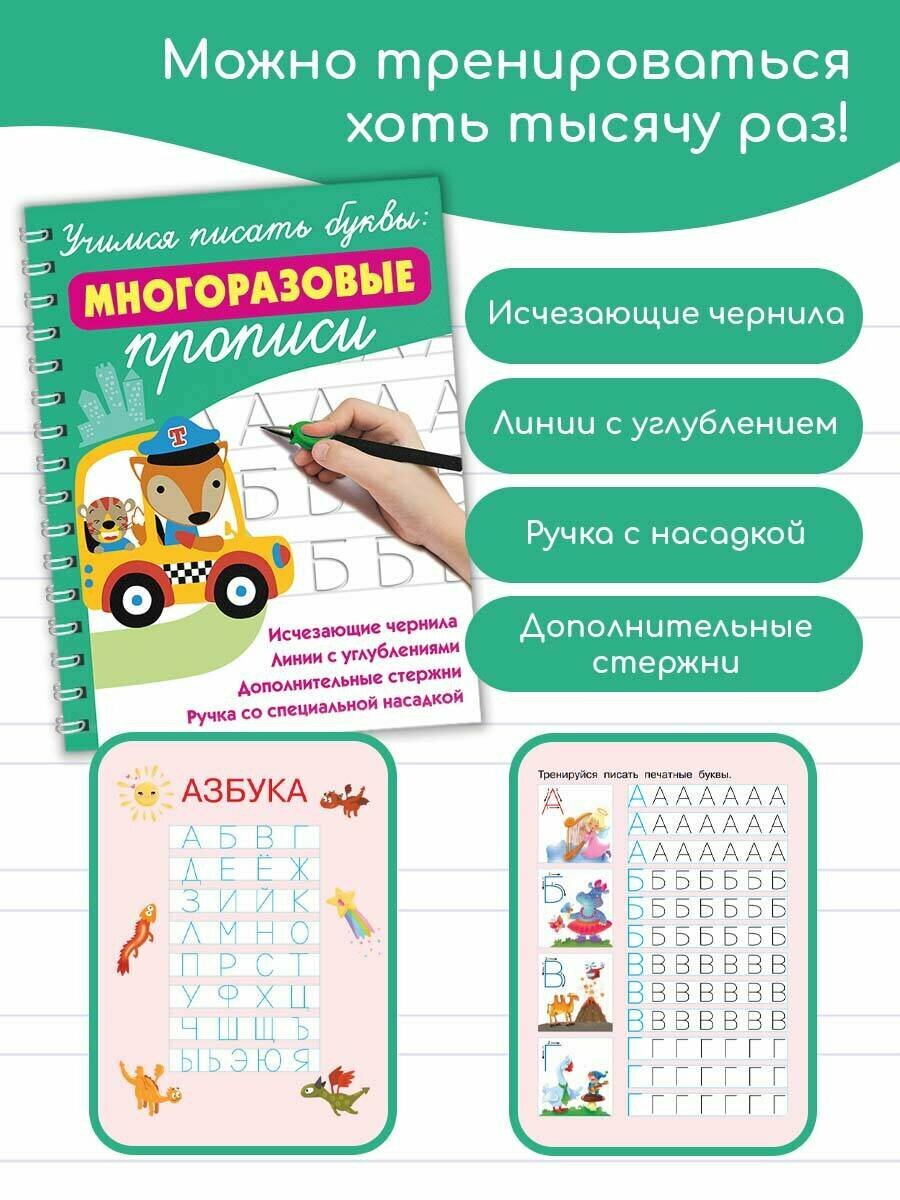 "Учимся писать буквы: многоразовые прописи" — это волшебная книга с трафаретными печатными буквами, которые помогут будущим школьникам научиться писать красивым почерком. В наборе — специальные чернила с эффектом исчезновения, ручка "пиши-стирай" и ластик. Можно тренироваться хоть тысячу раз!