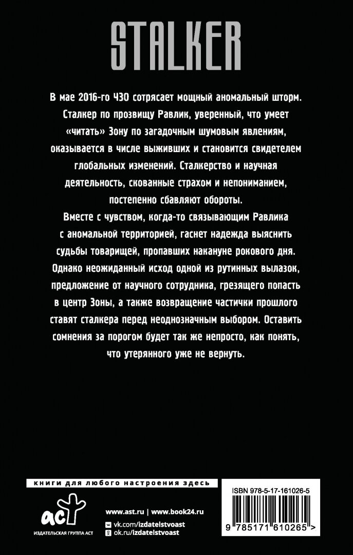В мае 2016-го ЧЗО сотрясает мощный аномальный шторм. Сталкер по прозвищу Равлик, уверенный, что умеет "читать" Зону по загадочным шумовым явлениям, оказывается в числе выживших и становится свидетелем глобальных изменений. Сталкерство и научная деятельность, скованные страхом и непониманием, постепенно сбавляют обороты. Вместе с чувством, когда-то связывающим Равлика с аномальной территорией, гаснет надежда выяснить судьбы товарищей, пропавших накануне рокового дня. Однако неожиданный исход одной из рутинных вылазок, предложение от научного сотрудника, грезящего попасть в центр Зоны, а также возвращение частички прошлого ставят сталкера перед неоднозначным выбором. Оставить сомнения за порогом будет так же непросто, как понять, что утерянного уже не вернуть.