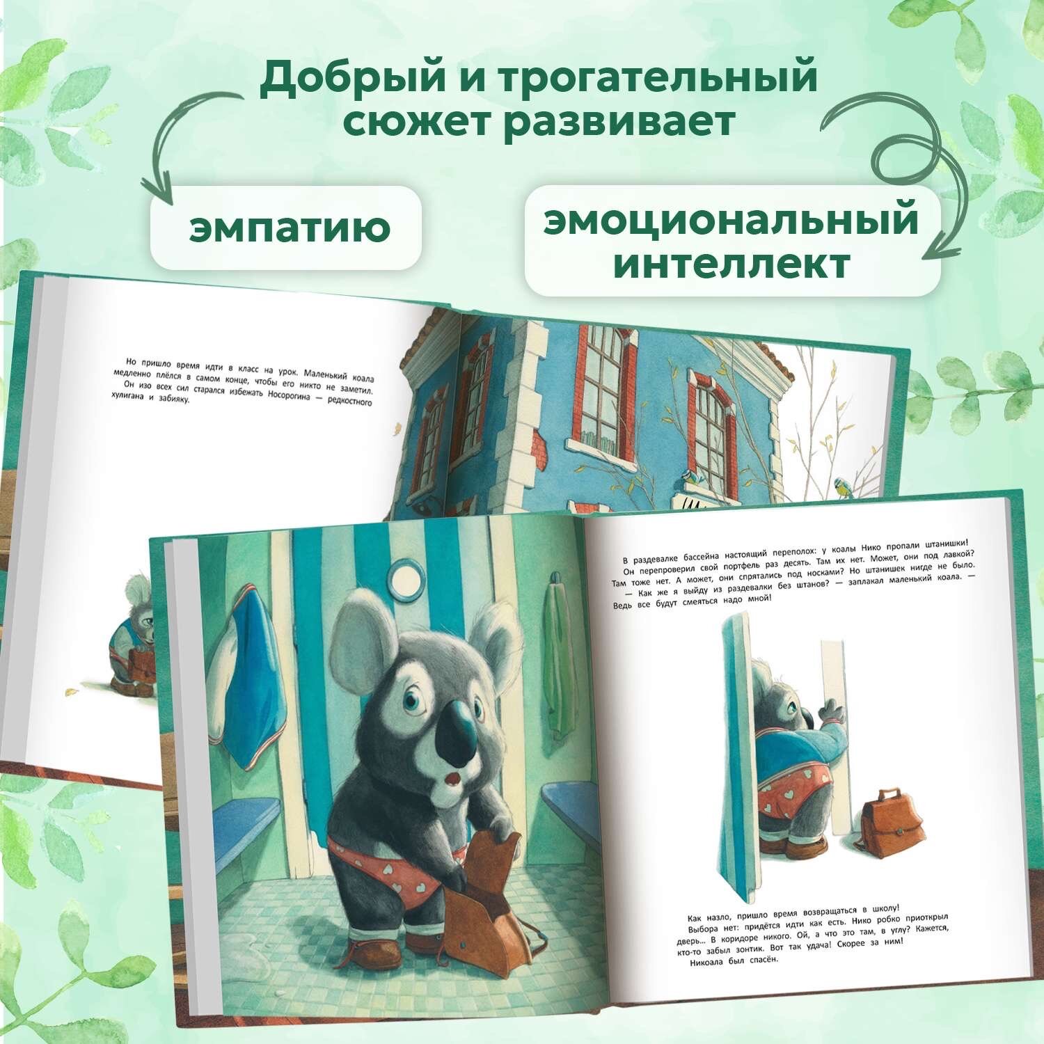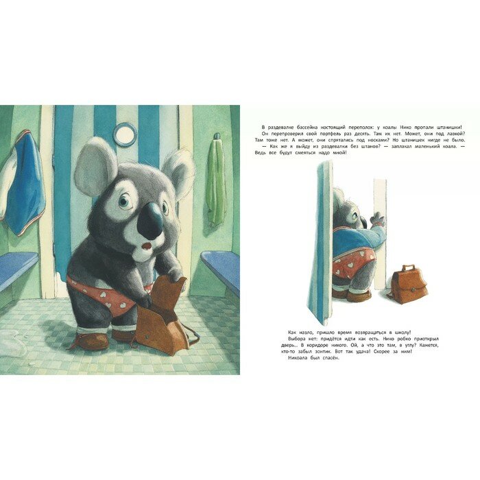 В раздевалке бассейна настоящий переполох! Коала Нико метался в панике: куда-то исчезли его штанишки! Как же он выйдет из раздевалки в одних носках и красных трусах в сердечко? Малыш расстроен, ведь все будут смеяться над ним. В течение дня маленькому Нико придётся проявить всю свою находчивость и смекалку, чтобы никто в школе не раскрыл его тайну.