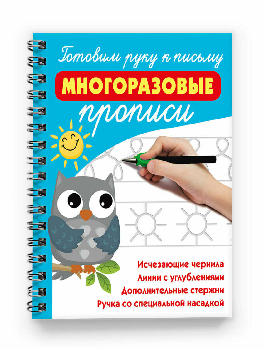 "Готовим руку к письму: многоразовые прописи" — это волшебная книга с трафаретными буквами, которые помогут будущим школьникам подготовить руку к письму. В наборе — специальные чернила с эффектом исчезновения, ручка "пиши-стирай" и ластик. Можно тренироваться хоть тысячу раз!