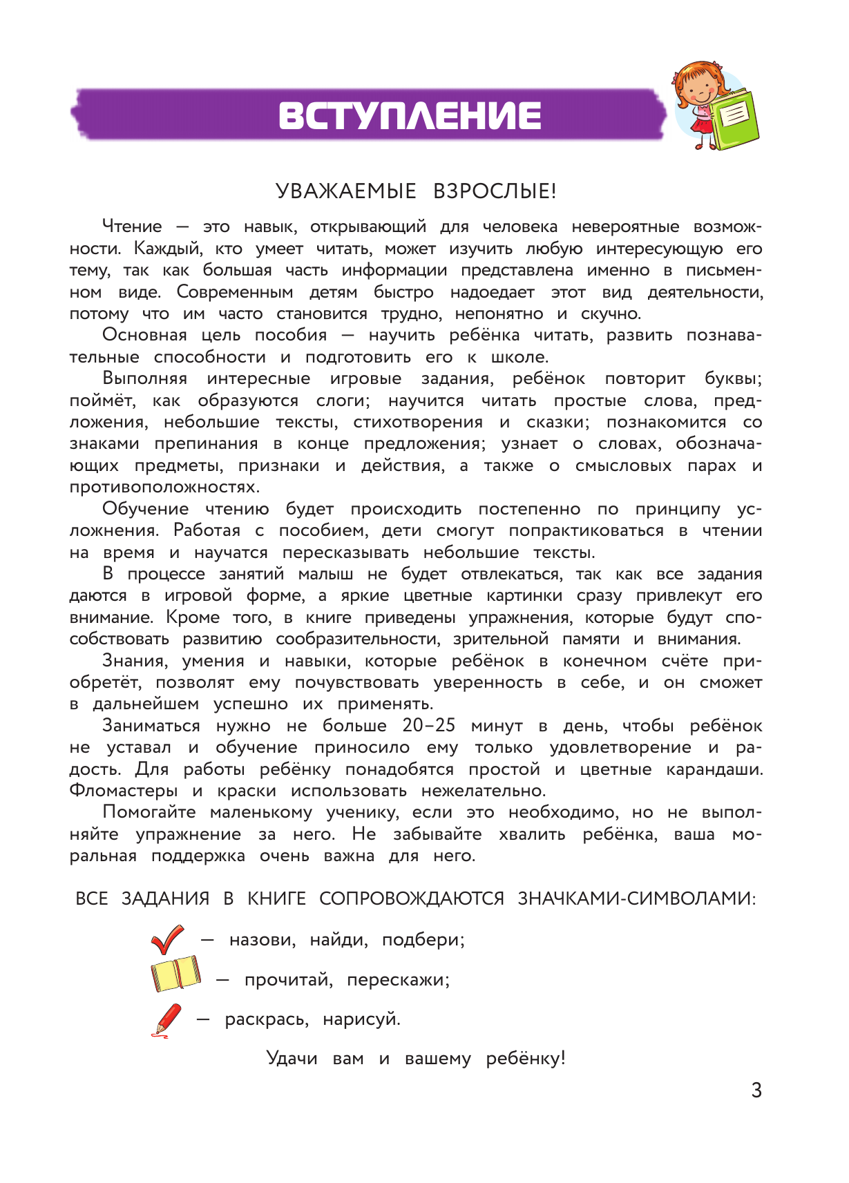 Основная задача пособия — обучение ребенка чтению с нулевого уровня.