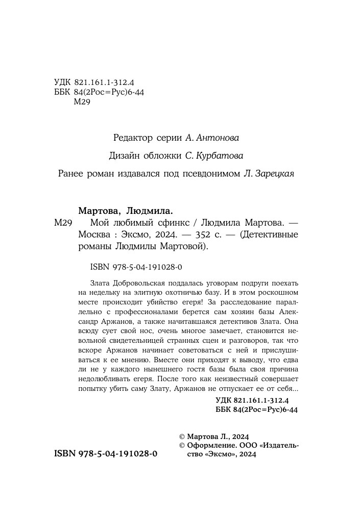 Книга: Мой любимый сфинкс (Людмила Мартова); Эксмо, Редакция 1, 2023