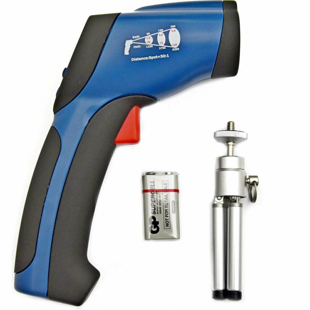 - современный дистанционный пирометр, позволяющий осуществить измерение температуры поверхности различных материалов в пределах от -50 °C до +1600°C. Возможность дистанционных измерений позволяет осуществить измерения температуры поверхностей движущихся объектов, деталей, находящихся под напряжением или имеющих высокую температуру. Это делает пирометр незаменимым инструментом контроля режимов работы оборудования и технологических параметров на предприятиях машиностроения, металлообработки, металлургии и других отраслей промышленности. Особенно полезным при контроле соблюдения технологических процессов будет функция непрерывных измерений, позволяющая осуществлять непрерывный мониторинг температуры. Пирометр имеет отличное оптическое разрешение 50:1. Иначе говоря, с расстояния 2 метра измерение температуры может быть осуществлено на участке диаметром всего 4 см. Для повышения точности наведения прибор оснащается лазерным указателем цели. Разрешение устройства составляет 0,1°С, а погрешность равна ±1,5% или ±2°С. Регулируемый от 0,1 до 1 коэффициент эмиссии позволяет одинаково эффективно осуществлять измерения поверхности, изготовленной из различных материалов. Из других особенностей прибор стоит выделить наличие большого жидкокристаллического дисплея с яркой подсветкой. Пирометр выполнен в виде пистолета и имеет удобное расположение кнопок, что даёт возможность управлять пирометром одной рукой. Прибор имеет функцию удержания данных, а также возможность определения минимального, максимального, среднего и дифференциального значений из ряда измерений. О выходе измеряемой температуры за предварительно установленные значения пирометр оповещает звуковым сигналом, что значительно снижает вероятность ошибки. Кроме того пирометр имеет: широкий диапазон эксплуатационных параметров окружающей среды: температура от 0°С до 50°С, влажность не более 90%; небольшие размеры 220?120?56 мм и вес 0,29кг; питание от одной батарейки или аккумулятора с напряжением 9В.