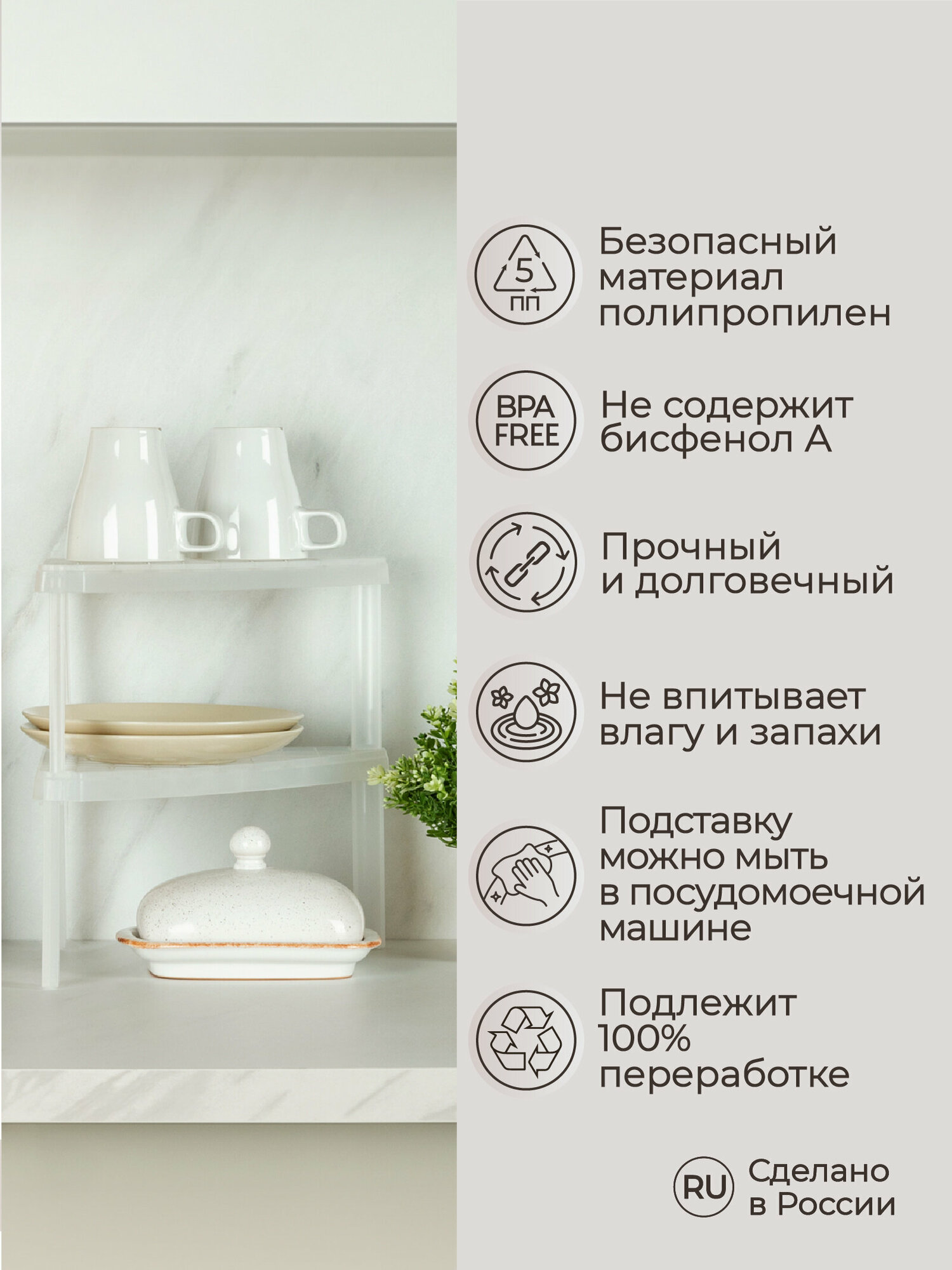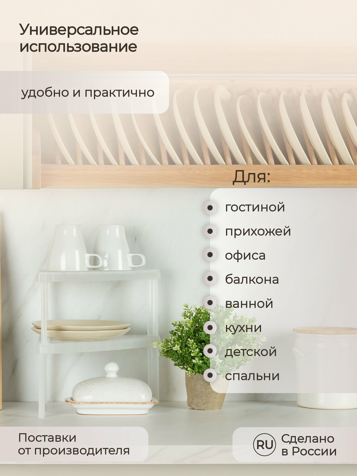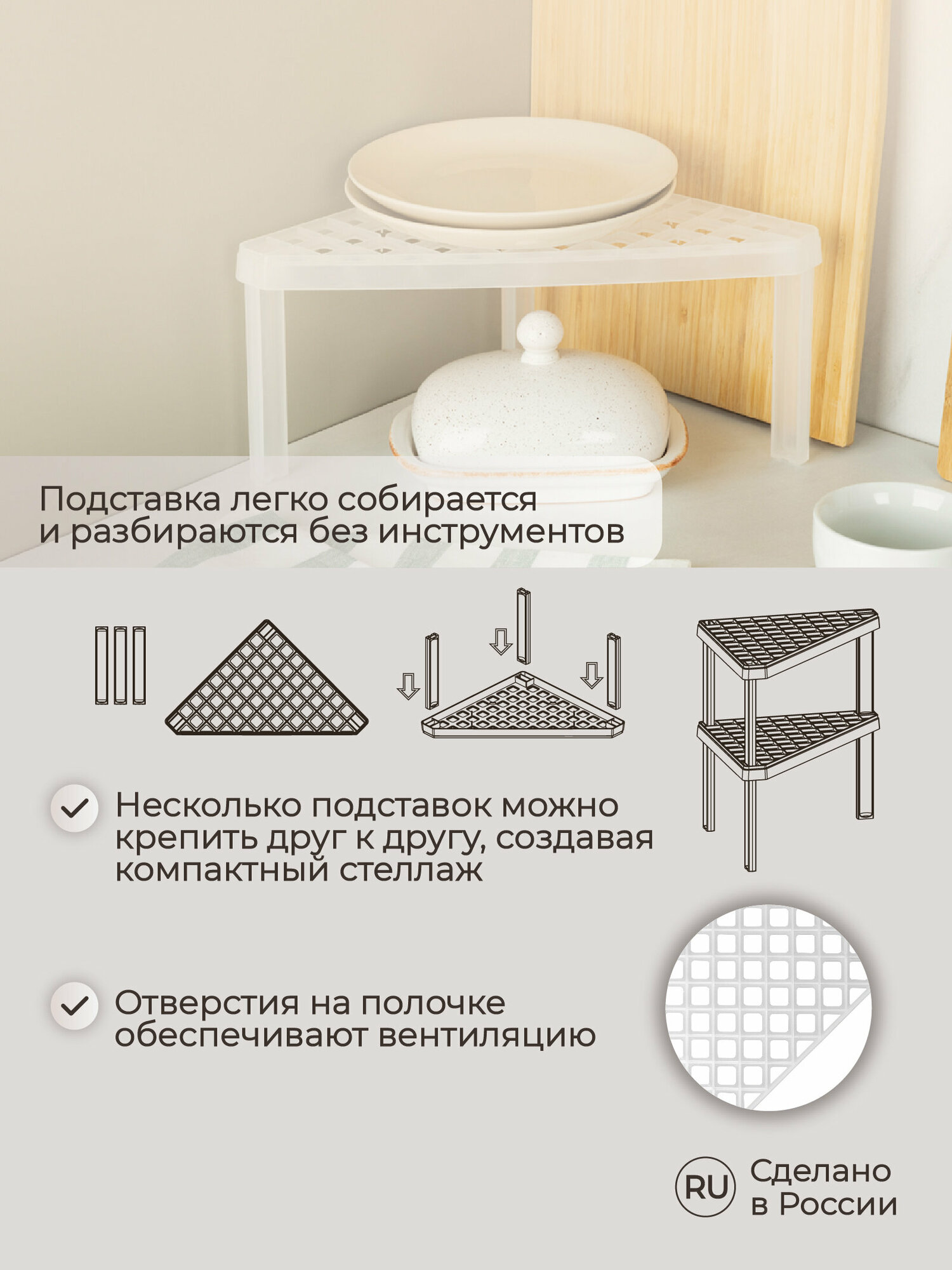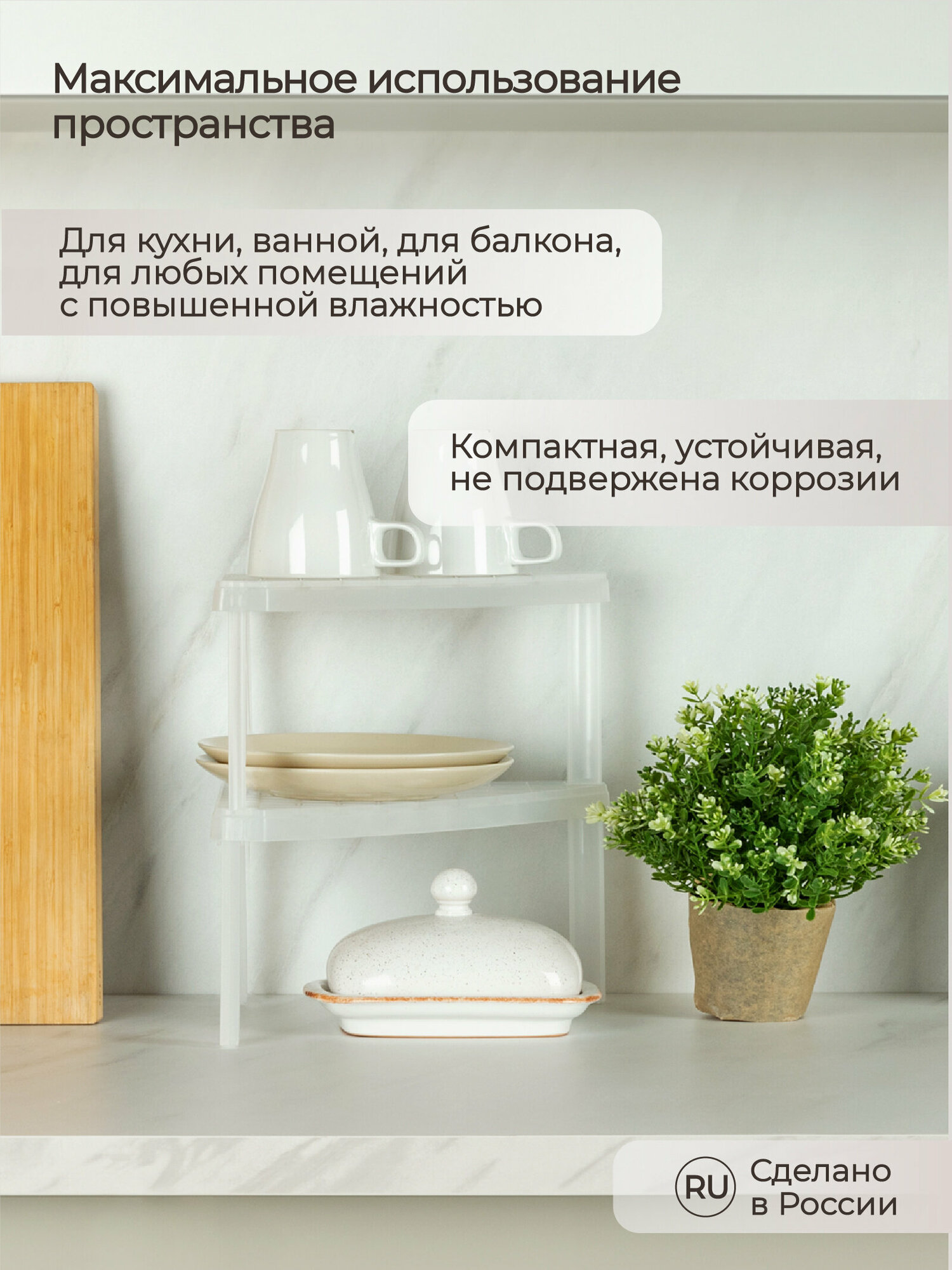Многофункциональная компактная подставка предназначена для максимального использования доступного невостребованного пространства не только на кухне, но и в любом помещении с повышенной влажностью, в ванной комнате или на балконе. Легкая и прочная, устойчива к влаге, проста в уходе - можно мыть в посудомоечной машине.