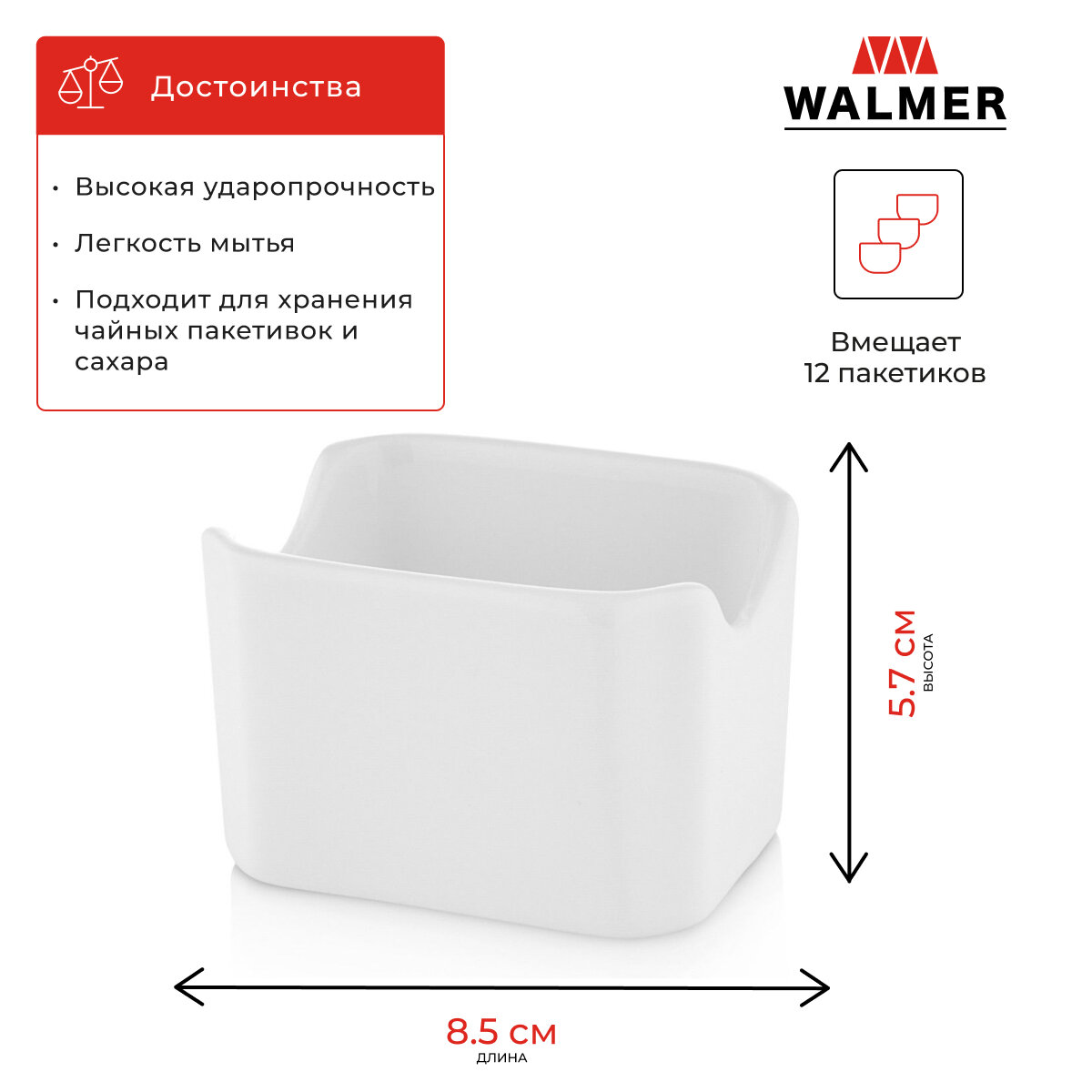 Представляем вашему вниманию стильную коллекцию из высокопрочного фарфора - Walmer Savanna. Линейка выполнена из упрочненного фарфора, который может использоваться как профессиональный в HoReCa.Органайзер для пакетиков чая Savanna выполнен в лаконичном, но очень современном дизайне. Это очень удобный кухонный аксессуар - контейнер подходит для хранения чайных пакетиков или стиков с сахаром.Белая фарфоровая подставка для чайных пакетиков и сахара поможет организовать пространство на вашей кухне и сделает хранение более удобным.Емкость вмещает в себя 12 пакетиков чая или сахара.Упрочненный фарфор отличают:Высокая ударопрочность. Она стала возможна благодаря легирующим, то есть улучшающим свойства основного материала, компонентам в составе керамической массы;Легкость мытья даже посуды с присохшей грязью благодаря специальному составу глазуриВысокая степень глянца;Устойчивость к температурным перепадам. Эту посуду можно использовать в микроволновке, посудомойке, холодильнике и даже духовке.Украсьте вашу жизнь классической посудой в современном прочтении, вместе с Walmer Savanna!