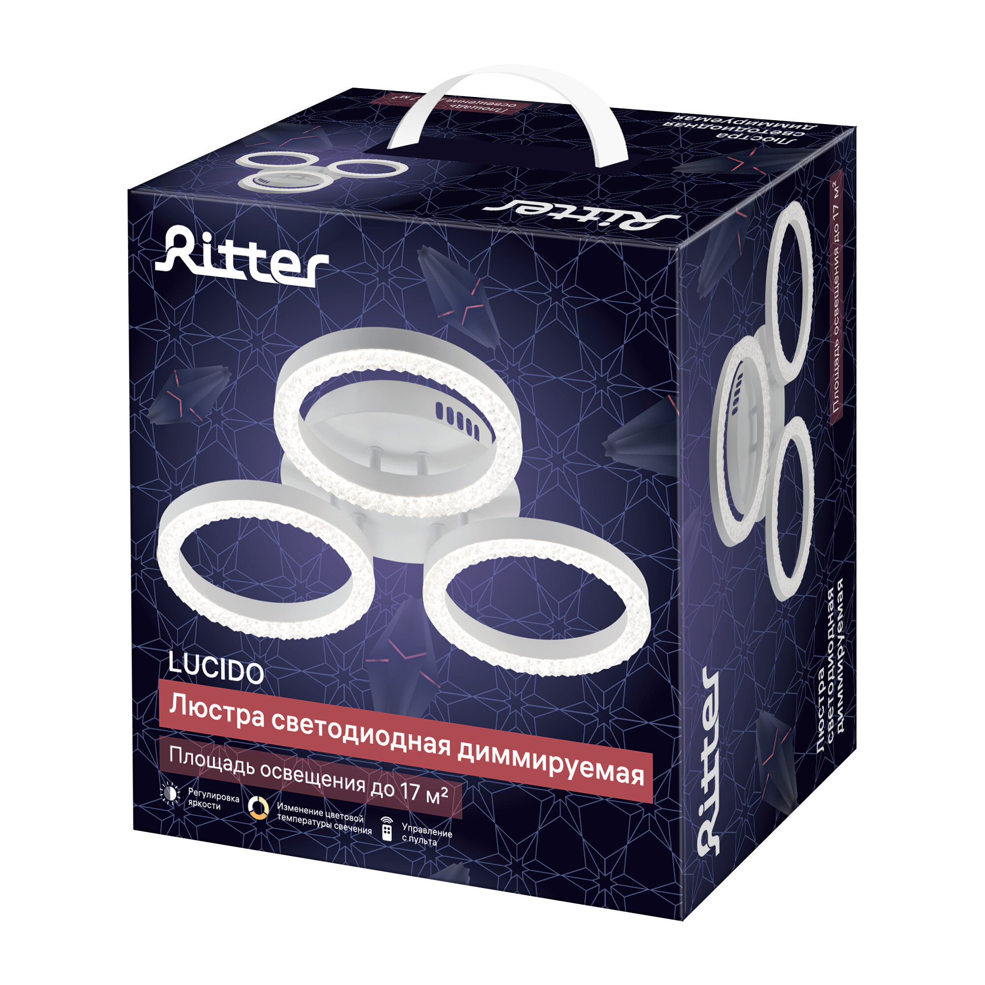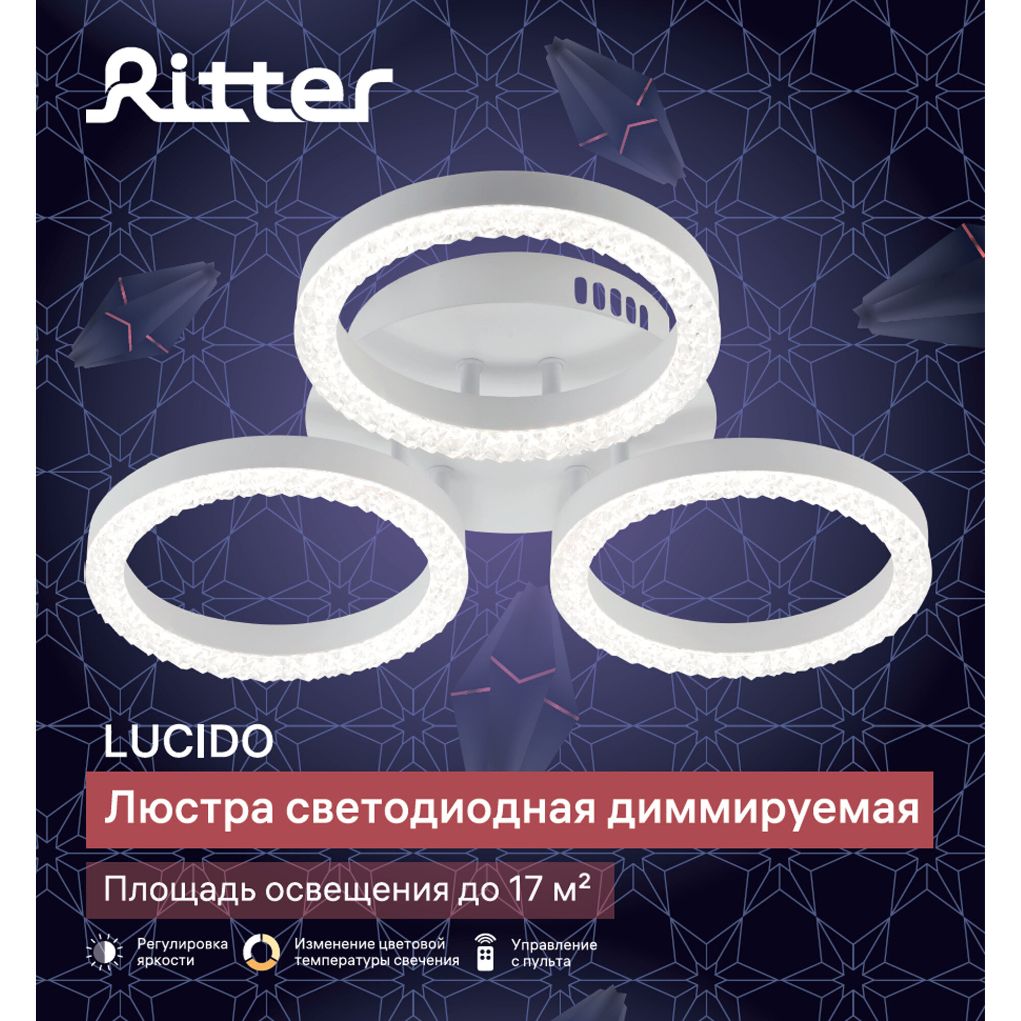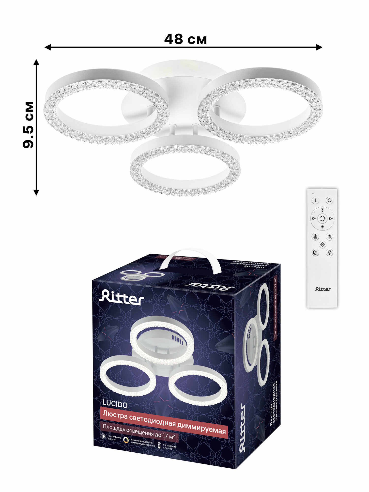 Потолочная светодиодная люстра Ritter LUCIDO - это отличный выбор для любых помещений площадью от 8 до 17 м2: гостиной, спальни, кухни, детской, студии, прихожей. Она удачно впишется в стили минимализм, неоклассика, лофт и другие. Люстра подходит для монтажа на все виды потолков — натяжные, подвесные, бетонные и др. Люстру из серии LUCIDO легко подключить и собрать. В выключенном состоянии она выглядит стильно и лаконично, а при включении обретает объемные контуры. Светодиодная люстра изготовлена из современных материалов, которые отличаются особой долговечностью — металла и акрила. Светодиоды, которыми оснащены световые элементы люстр Ritter, эффективны и экономичны. Они позволяют осветить помещения разной площади с минимальными затратами электроэнергии и имеют долгий срок службы. Светодиодные люстры современные, удобные и экономичные. Светодиодная люстра с пультом отличается, прежде всего, возможностью регулировать яркость освещения. Люстра Ritter LUCIDO имеет функцию регулировки яркости, три цветовых режима, а также ночник. С её помощью можно создать желаемую атмосферу в одно касание. Например, настроить яркость для бодрого утра, комфортного рабочего дня или романтического вечера. Теперь всегда можно подобрать наиболее подходящую яркость и температуру свечения для любой атмосферы и настроения. Способ управления всегда можно выбрать – какой предпочтительнее и удобнее. Заходя в помещение, можно включать освещение с помощью клавиши настенного выключателя, а перед сном – погасить свет с помощью пульта. Люстра также отлично подходит для детской комнаты: режим ночника позволяет ребенку чувствовать себя комфортно во время сна. Люстры Ritter украсят любой интерьер благодаря универсальному дизайну и станут неотъемлемой частью декора комнаты. Особенности - Управление пультом и выключателем. - Режим нейтрального свечения. - Регулировка яркости. - Режим ночника. Преимущества - Монтаж на любые виды потолков. - Подходит для низких потолков. - Универсальный белый цвет корпуса. - Долгая и безопасная эксплуатация.