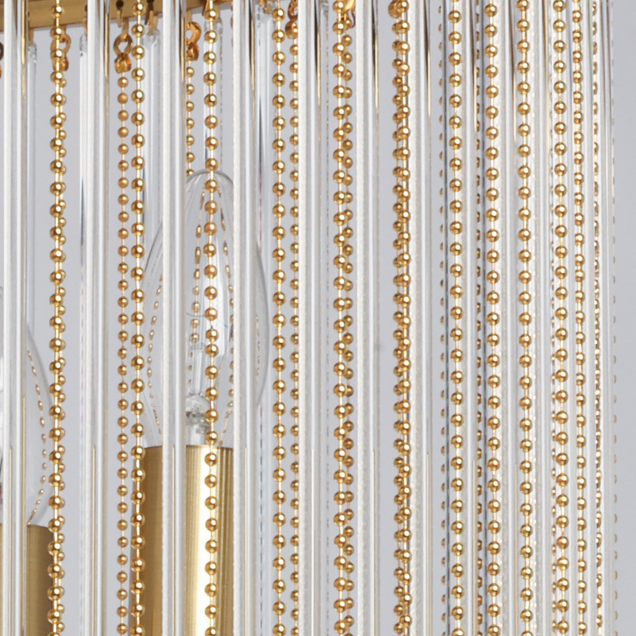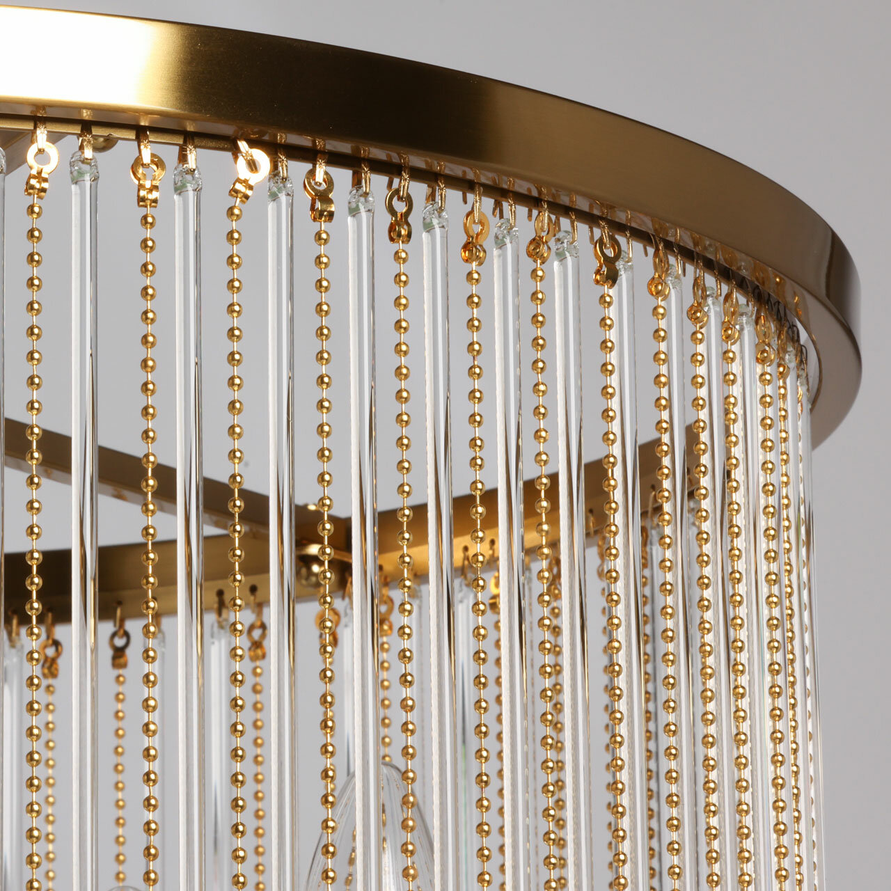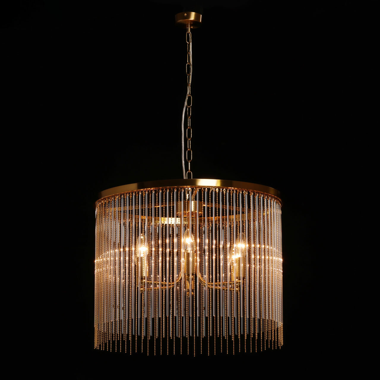 Металлическое основание подвесной люстры гальванизировано в цвет латуни. Светильник декорирован прозрачными стеклянными трубочками и металлическими цепочками, гальванизированными в цвет основания.