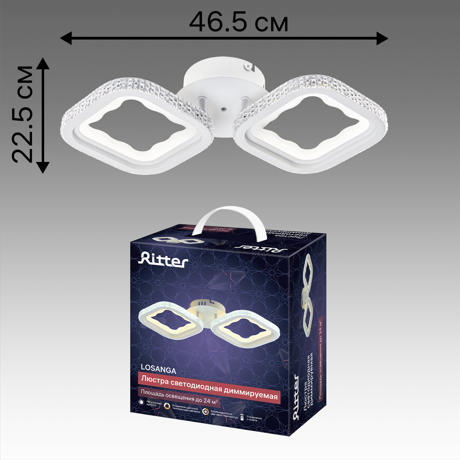 Потолочная светодиодная люстра Ritter LOSANGA - это отличный выбор для любых помещений площадью от 8 до 24 м2: гостиной, спальни, кухни, детской, студии, прихожей. Она удачно впишется в стили минимализм, неоклассика, лофт и другие. Люстра подходит для монтажа на все виды потолков — натяжные, подвесные, бетонные и др. Люстру из серии LOSANGA легко подключить и собрать. В выключенном состоянии она выглядит стильно и лаконично, а при включении обретает объемные контуры. Светодиодная люстра изготовлена из современных материалов, которые отличаются особой долговечностью — металла и акрила. Светодиоды, которыми оснащены световые элементы люстр Ritter, эффективны и экономичны. Они позволяют осветить помещения разной площади с минимальными затратами электроэнергии и имеют долгий срок службы. Светодиодные люстры современные, удобные и экономичные. Светодиодная люстра с пультом отличается, прежде всего, возможностью регулировать яркость освещения. Люстра Ritter LOSANGA имеет функцию регулировки яркости, три цветовых режима, а также ночник. С её помощью можно создать желаемую атмосферу в одно касание. Например, настроить яркость для бодрого утра, комфортного рабочего дня или романтического вечера. Теперь всегда можно подобрать наиболее подходящую яркость и температуру свечения для любой атмосферы и настроения. Способ управления всегда можно выбрать – какой предпочтительнее и удобнее. Заходя в помещение, можно включать освещение с помощью клавиши настенного выключателя, а перед сном – погасить свет с помощью пульта. Люстра также отлично подходит для детской комнаты: режим ночника позволяет ребенку чувствовать себя комфортно во время сна. Люстры Ritter украсят любой интерьер благодаря универсальному дизайну и станут неотъемлемой частью декора комнаты. Особенности - Управление пультом и выключателем. - Режим нейтрального свечения. - Регулировка яркости. - Режим ночника. Преимущества - Монтаж на любые виды потолков. - Подходит для низких потолков. - Универсальный белый цвет корпуса. - Долгая и безопасная эксплуатация.