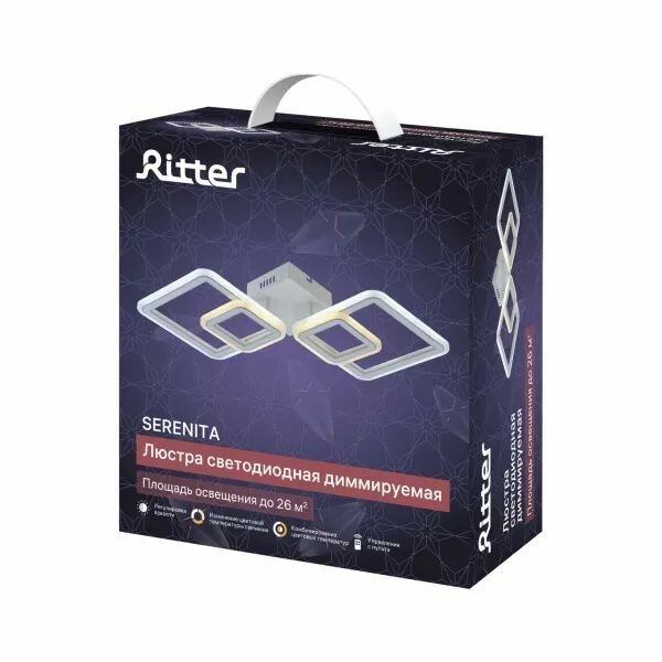 Потолочная светодиодная люстра Ritter SERENITA - это отличный выбор для любых помещений площадью от 8 до 26 м2: гостиной, спальни, кухни, детской, студии, прихожей. Она удачно впишется в стили минимализм, неоклассика, лофт и другие. Люстра подходит для монтажа на все виды потолков — натяжные, подвесные, бетонные и др. Люстру из серии SERENITA легко подключить и собрать. В выключенном состоянии она выглядит стильно и лаконично, а при включении обретает объемные контуры. Светодиодная люстра изготовлена из современных материалов, которые отличаются особой долговечностью — металла и акрила. Светодиоды, которыми оснащены световые элементы люстр Ritter, эффективны и экономичны. Они позволяют осветить помещения разной площади с минимальными затратами электроэнергии и имеют долгий срок службы. Светодиодные люстры современные, удобные и экономичные. Светодиодная люстра с пультом отличается, прежде всего, возможностью регулировать яркость освещения. Люстра Ritter SERENITA имеет функцию регулировки яркости, три цветовых режима, а также ночник. С её помощью можно создать желаемую атмосферу в одно касание. Например, настроить яркость для бодрого утра, комфортного рабочего дня или романтического вечера. Теперь всегда можно подобрать наиболее подходящую яркость и температуру свечения для любой атмосферы и настроения. Способ управления всегда можно выбрать – какой предпочтительнее и удобнее. Заходя в помещение, можно включать освещение с помощью клавиши настенного выключателя, а перед сном – погасить свет с помощью пульта. Люстра также отлично подходит для детской комнаты: режим ночника позволяет ребенку чувствовать себя комфортно во время сна. Люстры Ritter украсят любой интерьер благодаря универсальному дизайну и станут неотъемлемой частью декора комнаты. Особенности - Управление пультом и выключателем. - Режим нейтрального свечения. - Регулировка яркости. - Режим ночника. Преимущества - Монтаж на любые виды потолков. - Подходит для низких потолков. - Универсальный белый цвет корпуса. - Долгая и безопасная эксплуатация.