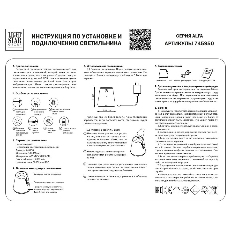 | Номенклатура | 745950 Настольная лампа ALFA LED 5W RGB LM БЕЛЫЙ 3000K DIM |