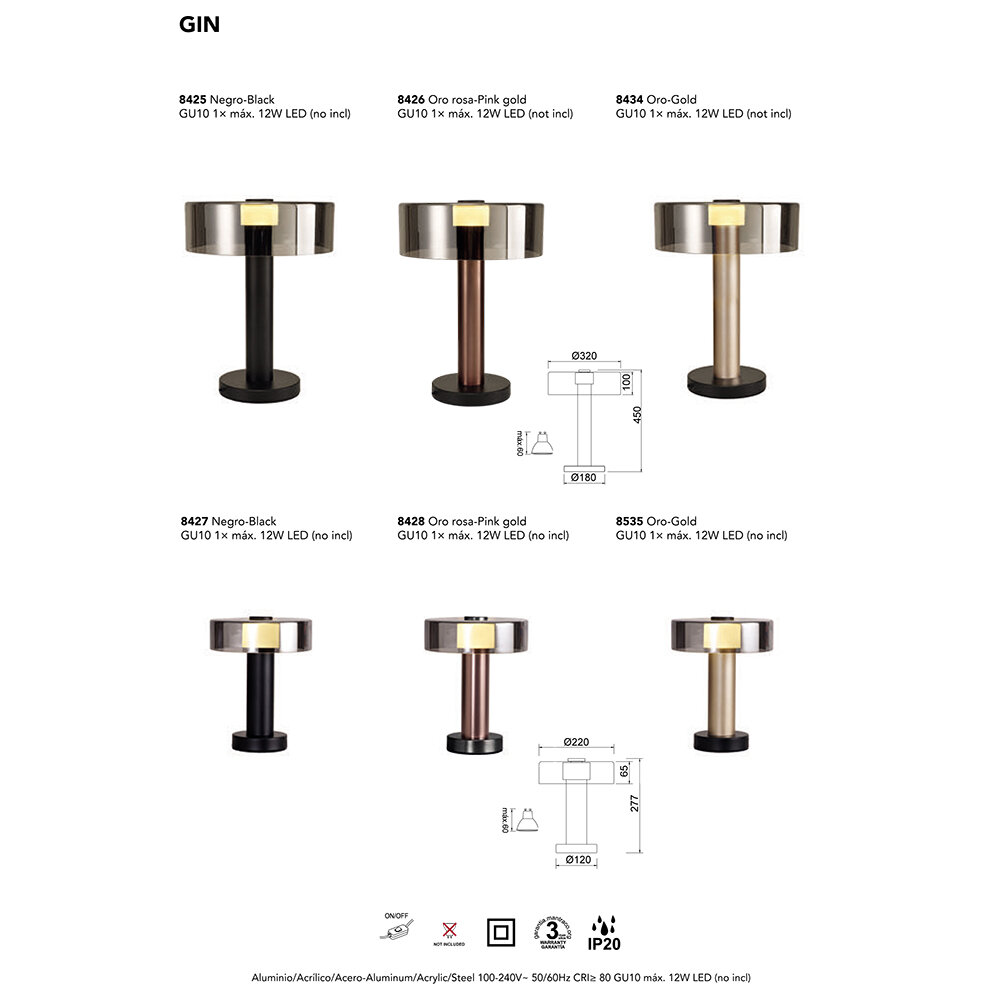 Серия светильников Gin собрала в своем образе все черты сдержанного мужского характера. Самодостаточный по формам, в основе которых лежат цилиндрические плафон, основание и ножка, он идеально вписывается в современные интерьерные пространства. Всегда дымчатая загадочность стеклянного абажура мягко рассеивает свет вокруг себя. Строгим разнообразием в дизайне являются лишь сближенные тонально цвета металлических элементов: полуматовый черный, благородный медный и платиновый. Рапорт из двух разных по размеру настольных ламп и подвеса идеален для гостиничных комплексов, спален, кабинетов и офисов.