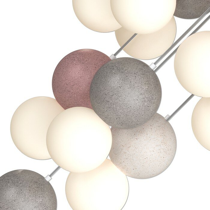 Коллекция Estruzzo создана с использованием бетона, который уже перестал быть исключительно строительным материалом и активно используется дизайнерами для создания арт объектов. Специальные добавки, используемые для производства декоративного бетона, делают его структуру более гладкой и прочной, позволяя идеально отшлифовывать поверхность. Плафоны из опалового стекла приглушают брутальность основного материала и делают коллекцию подходящей для разных интерьеров. В подвесах использован окрашенный бетон, придающий изделиям еще большую декоративность. При монтаже каскадного светильника нужно учитывать его большой вес.