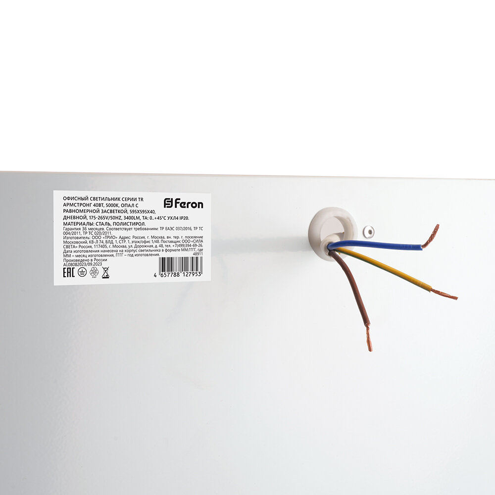 RA>90. Светильник встраиваемый светодиодный, АРМСТРОНГ (ДВО) FERON Офисный светильник серии TR Армстронг 54Вт, 4000К, CRI90, опал, 54W 4000К (белый), 175-265V, 5400Lm, IP20, угол рассеивания 120°, цвет белый, корпус сталь, рассеиватель полистирол, 595*595*40 мм, монтажн.отв. 595*595 мм.