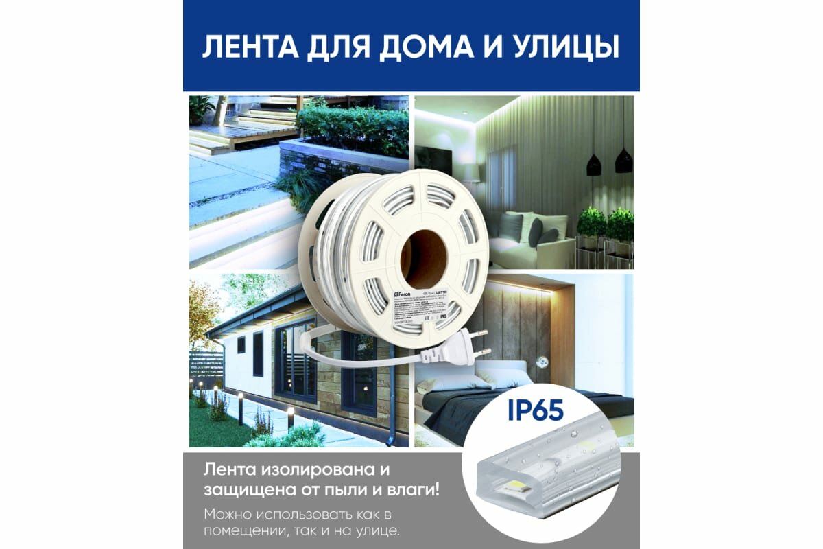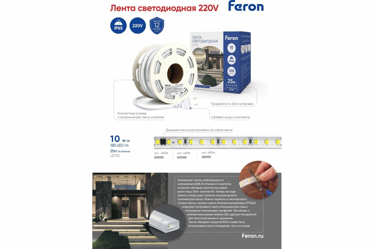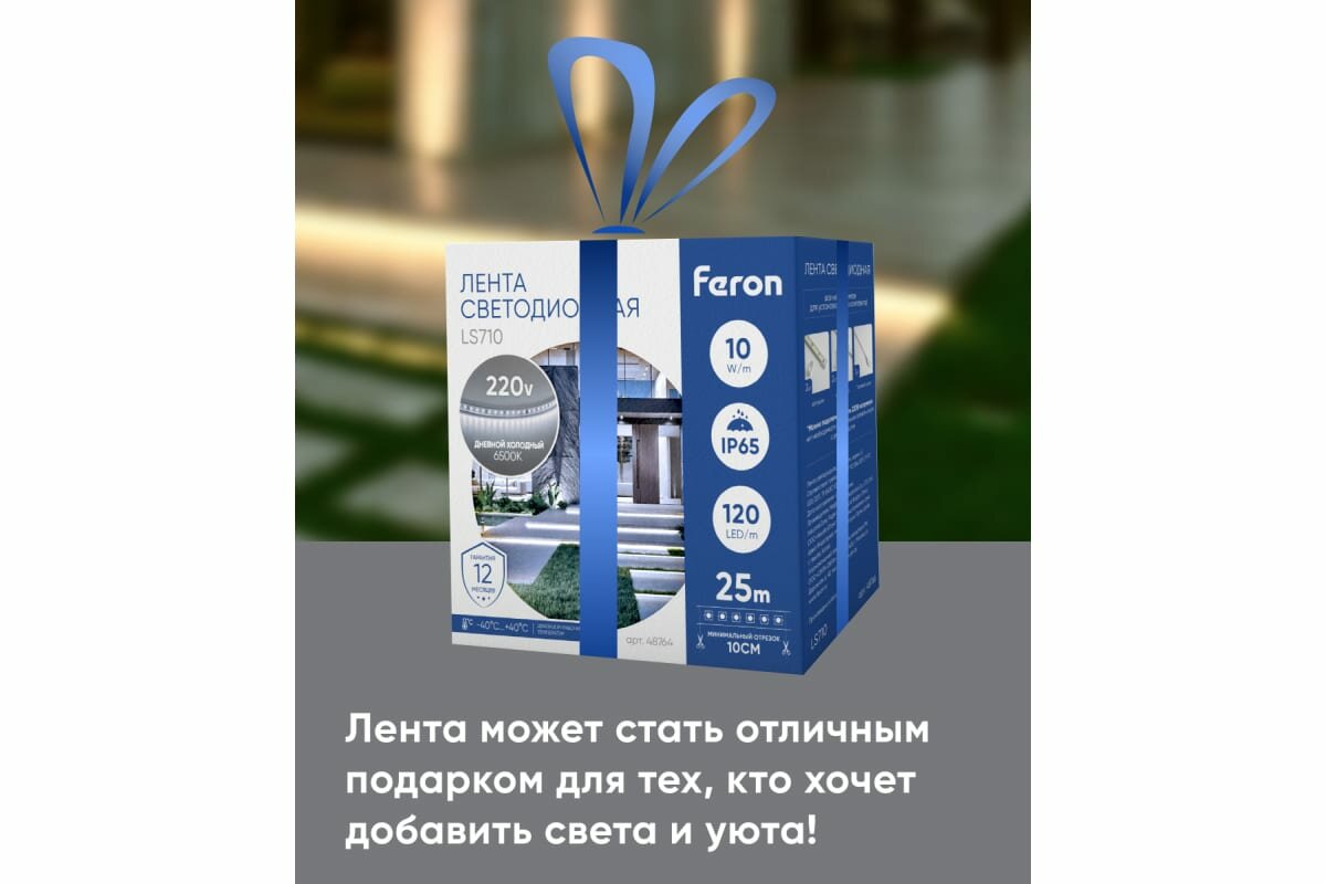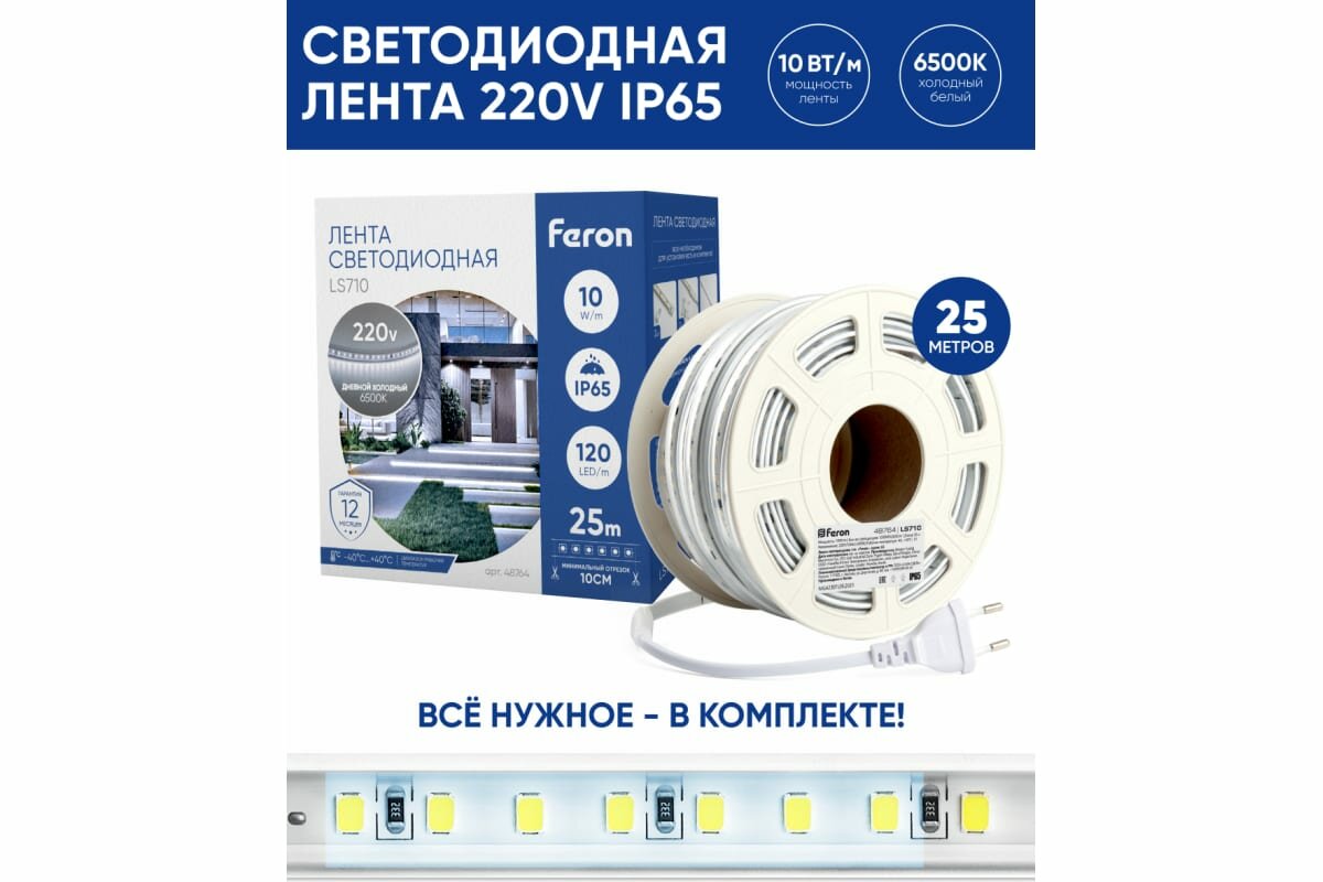 Лента на 220 В подключается напрямую без блока питания, что упрощает монтаж.Лента светодиодная 220V FERON LS710, 120*SMD2835, 10W/m, IP65, 6500К (белый холодный), в комплекте 1 сетевой шнур, 2 заглушка, 2 коннектор, Кратность резки мм 100мм, раб.t -40°C - +40°C, бобина 25 метров*11мм*5 мм