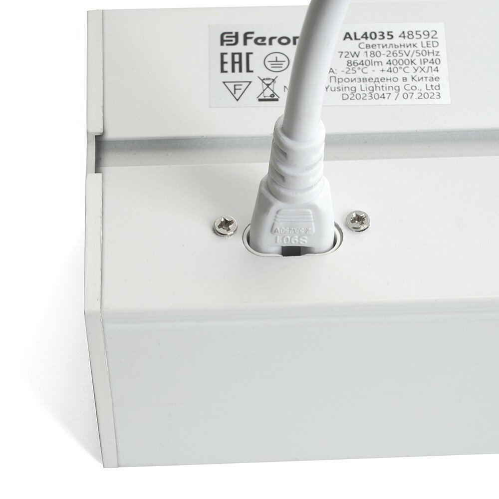 Возможность соединения в линию до 500Вт ;Комплект для подвесного монтажа и накладного. Комплектация соединительно для транзитного соединения светильников, 2 заглушки, скобы для жесткого соединения светильников в линию и вводной кабель питания 1м.Светильник имеет 2 входных отверстия –одно сбоку и второе сверху светильника ,чтобы спрятать кабель в начале линии и соответственно с др. торца светильника выходное отверстие.. Светильник линейный светодиодный, (ДПО) FERON AL4035, 72W, 6500К (дневной), 180-265V, 8640Lm, IP40, цвет белый, корпус алюминий, рассеиватель пластик, 1500*55*70 мм
