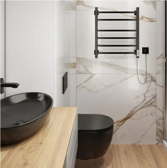 Полотенцесушитель изготовлен из углеродистой стали с использованием профильных труб квадратного и прямоугольного сечения. Имеет нагревательный элемент кабельного типа с регулировкой времени работы и мощности нагрева. Изделие окрашиваются порошковой эмалью с приятной матовой фактурой, что обеспечивает антикоррозийные свойства и современный внешний вид.