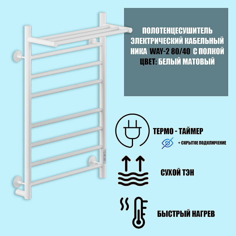 Полотенцесушители Way-2 с сухим ТЭНом имеет встроенный терморегулятор, который позволяет выбрать максимально комфортную температуру, а функция отключения при нагреве позволяет значительно экономить электроэнергию. А так же, имеет выключатель на корпусе для удобства отключения электропитания. Электрический полотенцесушитель Ника коллекции WAY - это отличное решение для ванной комнаты любого стиля и размера.