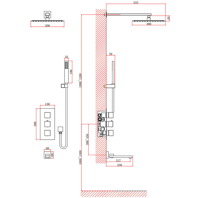 - Размер верхнего душа (ШxД): 300x300 мм.
