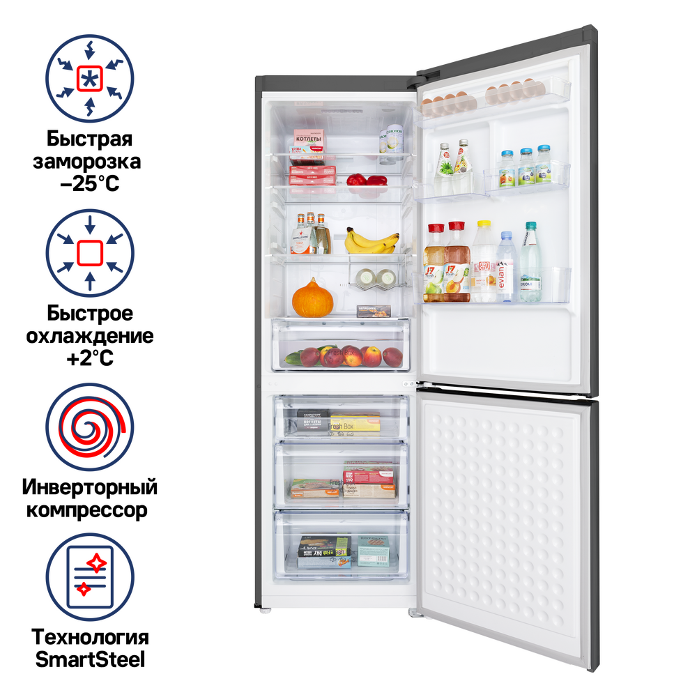 Функция «ECO» активизирует работу прибора в режиме оптимальной энергетической эффективности и гарантирует долгое сохранение свежести продуктов. Функция «Быстрого замораживания» в морозилке помогает быстро заморозить продукты с сохранением их полезных свойств. Функция «Быстрого охлаждения» в холодильном отсеке долго сохраняет свежесть продуктов. Сигнализация открытой дверцы срабатывает через 2 минуты. Есть возможность ее перенавешивания на правую и левую сторону. Отсутствие отпечатков пальцев на ней возможно благодаря покрытию двери из нержавеющей стали Smart Steel. Блокировка от детей предотвращает неправильную работу агрегата из-за случайного сброса настроек. Режим «Отпуск» обеспечивает экономию потребления энергии в отсутствии хозяев.