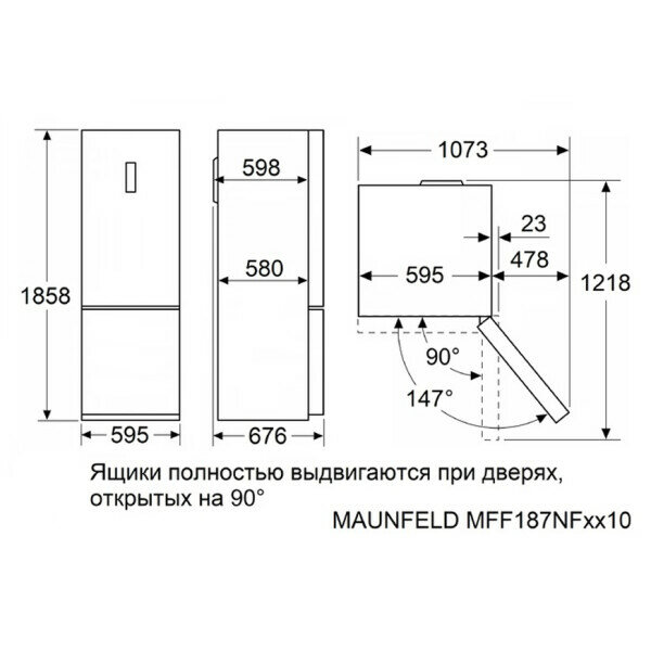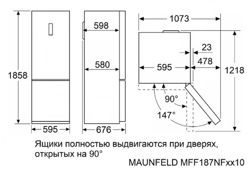 Холодильник двухкамерный Maunfeld MFF187NFIX10 — вместительный агрегат с грамотно продуманным пространством внутри. С помощью сенсорной панели управления с интеллектуальной системой устанавливают температуру отдельно для каждого отсека. Инверторный компрессор экономит электрическую энергию и уменьшает рабочий шум. В холодильном отсеке есть 4 полочки из закаленного стекла с металлическими фреймами и 4 полочки на двери. Морозилка оснащена 3 выдвижными ящиками. Внутри холодильник имеет противобактериальное покрытие, предотвращающее формирование плесени и развитие микробов.