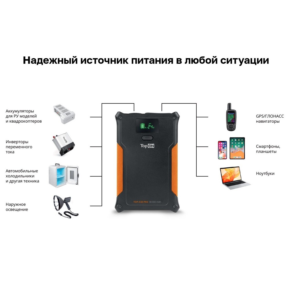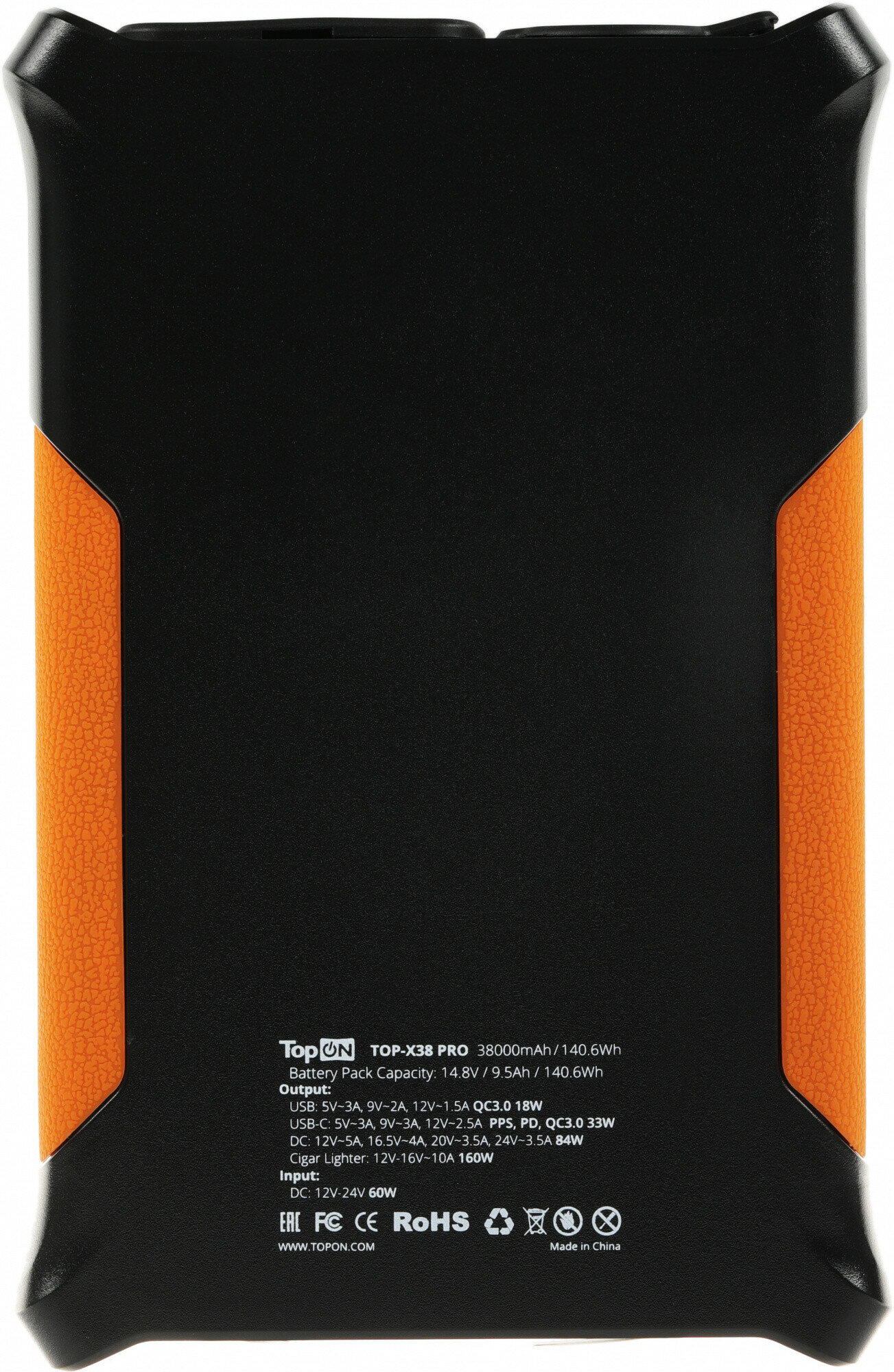 Защищенная внешняя аккумуляторная батарея TopON TOP-X38 PRO незаменима для кемпинга, походов, путешествий, охоты, рыбалки, длительных поездок и фестивалей. Благодаря высокой емкости может использоваться в качестве аварийного источника питания.Одновременную зарядку нескольких устройств обеспечивают DC порт 12V-24V 84W для зарядки ноутбуков и техники, автомобильная розетка мощностью 160W, а так же USB Type-C 33W, поддерживающий большинство протоколов быстрой зарядки (PPS, PD, QC3.0) и дополнительный умный USB 18W QC3.0.Батарея поддерживает питание автомобильных холодильников, пылесосов и термосов, электрических насосов, наружного освещения, освещения для охоты и рыбалки, электрических катушек для рыбалки, портативных вентиляторов, GPS-навигаторов, раций и металлоискателей. Совместима с инверторами переменного тока, что увеличивает совместимость с большинством бытовых приборов и зарядок. Подходит для зарядки современных ноутбуков, планшетов, смартфонов, аккумуляторов для РУ-моделей, квадрокоптеров, дронов, электроинструмента, фото/видео камер и другой цифровой техники.Зарядить TOP-X38 PRO можно с помощью сетевого блока питания, авторозетки или солнечной панели через DC порт с диапазоном входного напряжения от 12V до 24V. Внешний аккумулятор поддерживает одновременную работу и зарядку, может использоваться как накопитель энергии для солнечной панели. Встроенный LED экран отображает уровень заряда и исходящее напряжение порта DC. Ударопрочный корпус с защитой IP65 от попадания пыли и брызг сделает эксплуатацию надежной даже в самых экстремальных условиях.Соответствует стандартам безопасности ГОСТ 12.2.007.12-88, EAC, CE, FCC, ROHS, UN38.3, ETL, UL, MSDS, PSE.