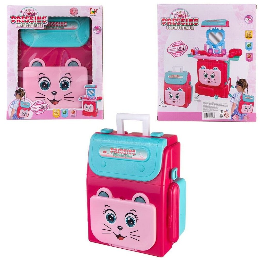 Набор Юная модница просто мечта любой девочки, ведь в нем есть все, чтобы создать модный образ, а также его удобно брать с собой в дорогу. Набор упакован в компактный чемоданчик, на котором красуется симпатичная мордочка котенка. Чемоданчик можно трансформировать. С помощью дополнительных элементов набора чемоданчик можно легко преобразовать в портативный Салон красоты. Чемоданчик можно переносить на спине, ведь с помощью специальных лямок, чемоданчик превращается в удобный рюкзак. Упаковка и детали наборы выполнены из качественного прочного пластика привлекательных цветов.