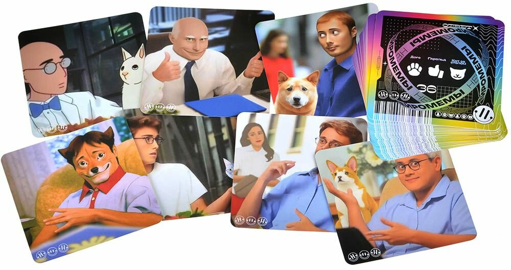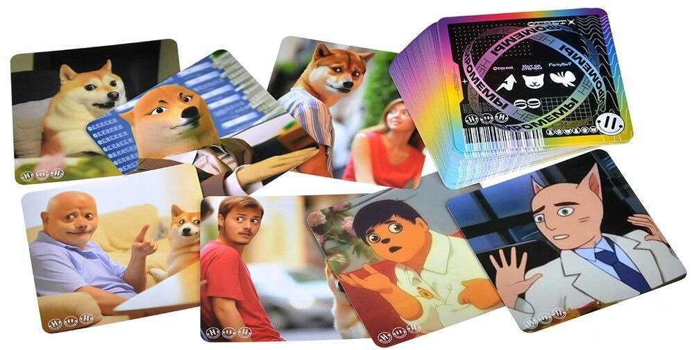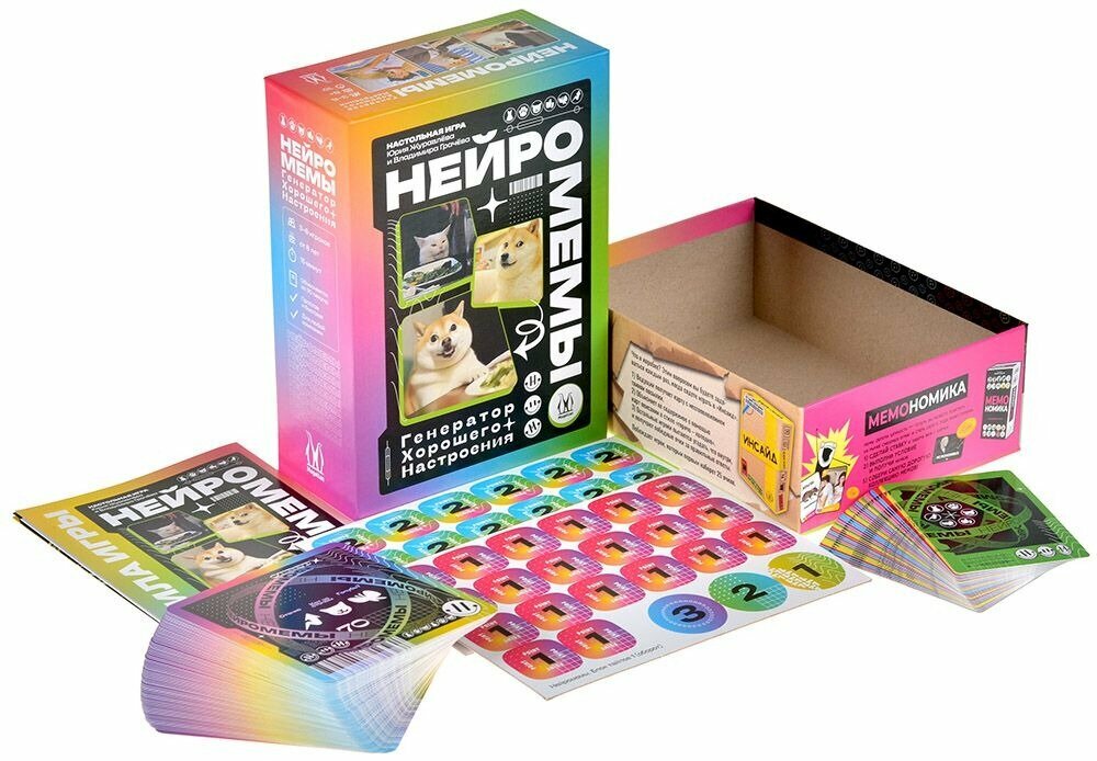 | Комплектация | 36 стартовых мемов, 70 карт нейромемов, 5 жетонов очереди, 40 монет, Правила игры |
