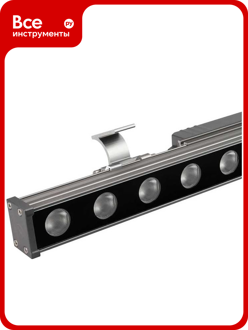 Линейный прожектор. Мощность 24 Вт, св. поток 1920 лм, 80 лм/Вт, теплый 3000 K, CRI>80, угол 30°, напряжение питания 230 В. Серый прямоугольный корпус из алюминия, экран стекло, степень защиты IP65. Размер: длина 1000 мм, ширина 40 мм, высота 30 мм. Монтаж на кронштейнах.