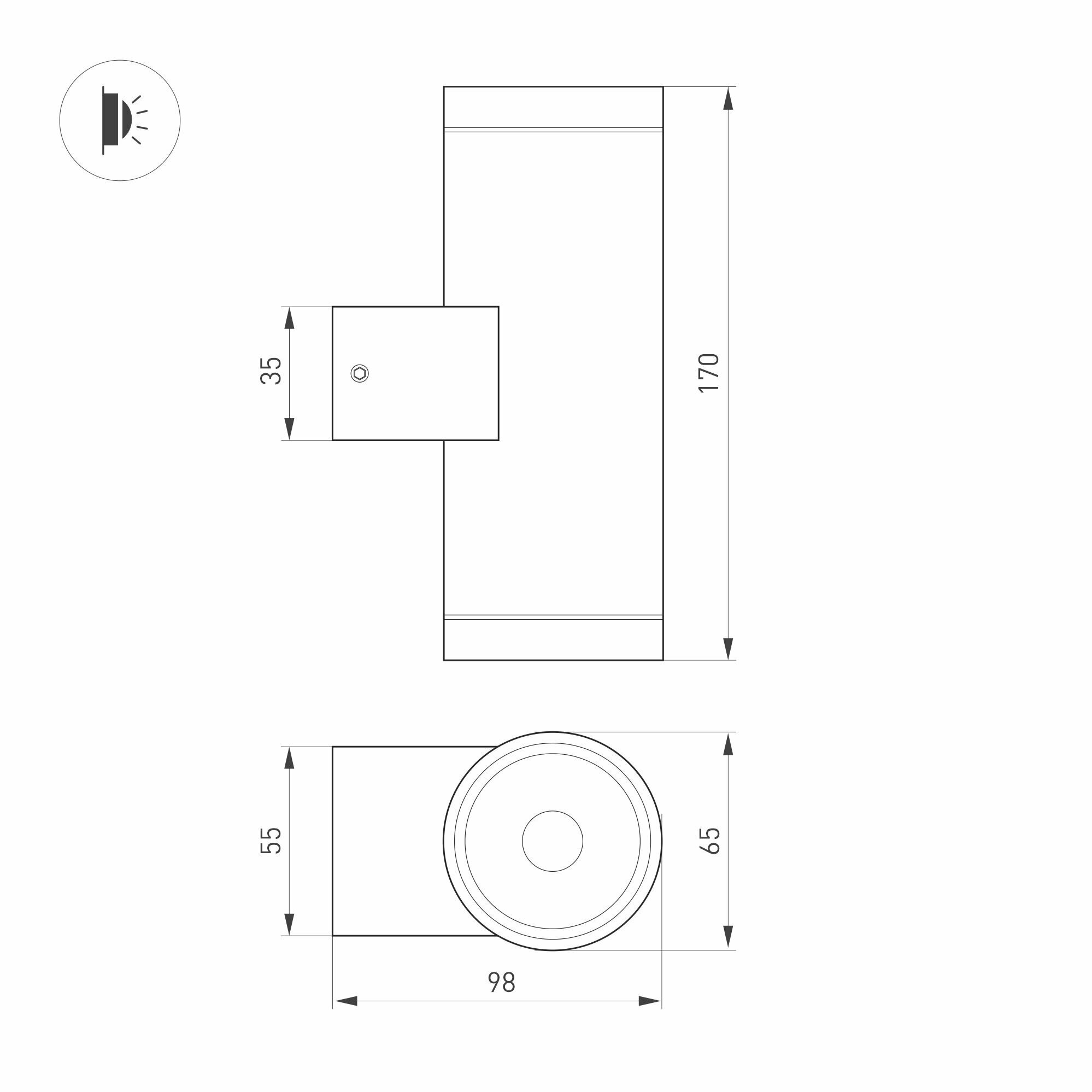 Накладной настенный светильник, свечение вверх/вниз. Мощность 18 Вт, св. поток 1820 лм, 101 лм/Вт, дневной 4000 K, CRI>80, угол 2x23°, напряжение питания 230 В. Темно-серый фигурный корпус из алюминия, экран стекло, степень защиты IP65. Размер: длина 170 мм, ширина 65 мм, высота 98 мм. Монтаж накладной. Драйвер встроенный, пульсация
