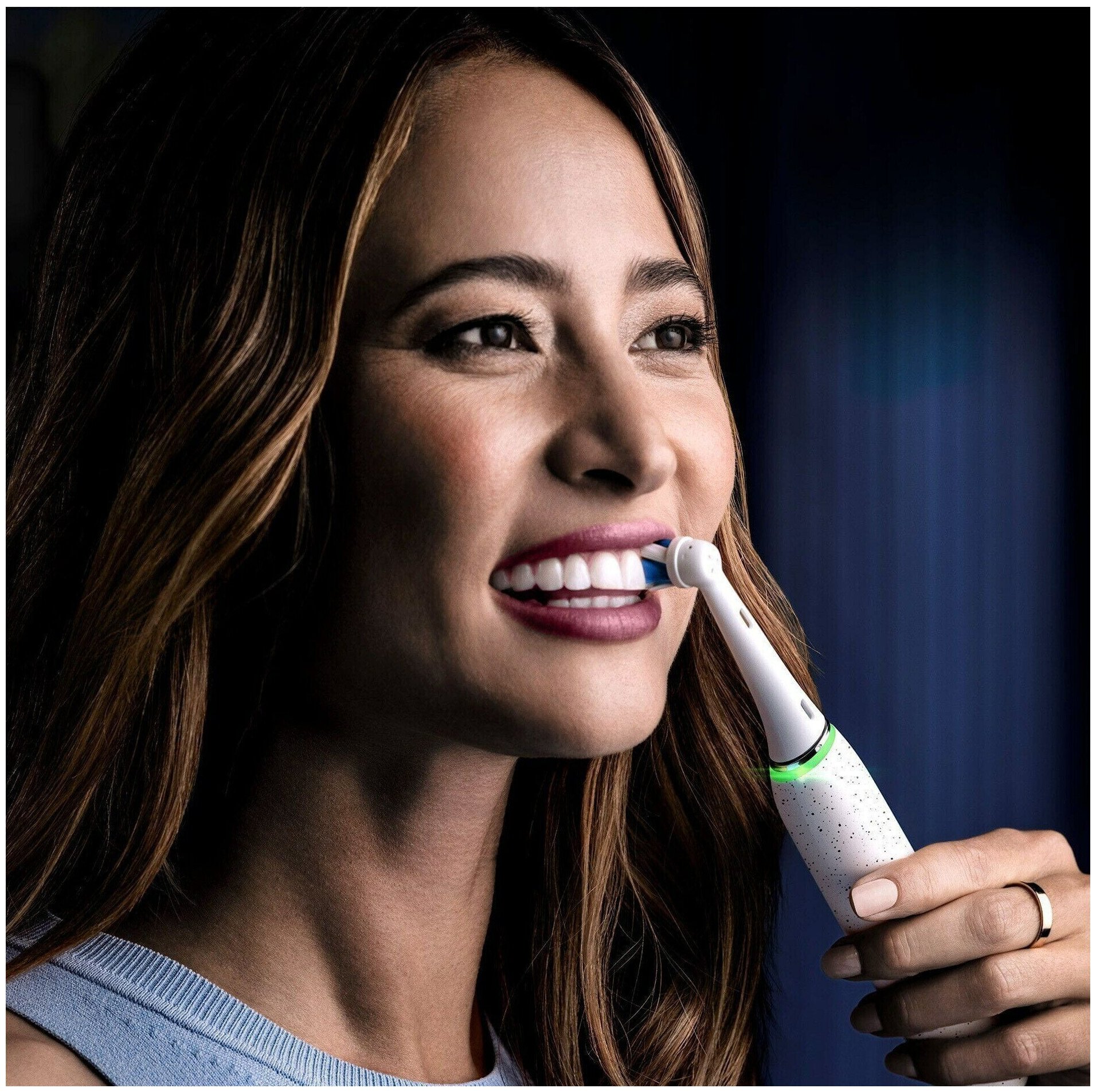 Щётка iO10 с iOSense, последнее пополнение революционной линейки iO, призвана произвести революцию в том, как мы чистим зубы, обеспечивая как никогда ранее персонализированный подход. Новое устройство iOSense работает на основе искусственного интеллекта, интуитивно направляя чистку зубов и обеспечивая персонализированный опыт чистки зубов как ни в одном другом случае. iOSense оснащен таймером для оптимального времени чистки зубов и часами Wi-Fi. Интуитивно понятные световые индикаторы iOSense заботятся о том, чтобы ни один участок не остался без внимания. Дорожный футляр Power2Go зарядит вашу щетку во время поездок. Сочетает в себе уникальную круглую насадку. Умный датчик давления сигнализирует красным световым сигналом о чрезмерном надавливании и зеленым - о правильной чистке. Oral-B iO10 имеет 7 режимов работы и поставляется с функцией отслеживания и обучения в режиме реального времени: Ежедневная чистка, Чувствительная чистка Супер Чувствительная (новый) Интенсивный (вероятно, похож на Pro / Deep Clean) Отбеливающий Массаж десен Чистка языка Oral-B iO интерактивный дисплей, небольшой экран дает визуальную обратную связь, от улыбающегося лица до графического таймера, который помогает вам отслеживать чистку по времени Согласно рекомендациям стоматологов продолжительность чистки должна составлять от 2 минут. Взаимодействовать с щеткой пользователю помогает мобильное п?